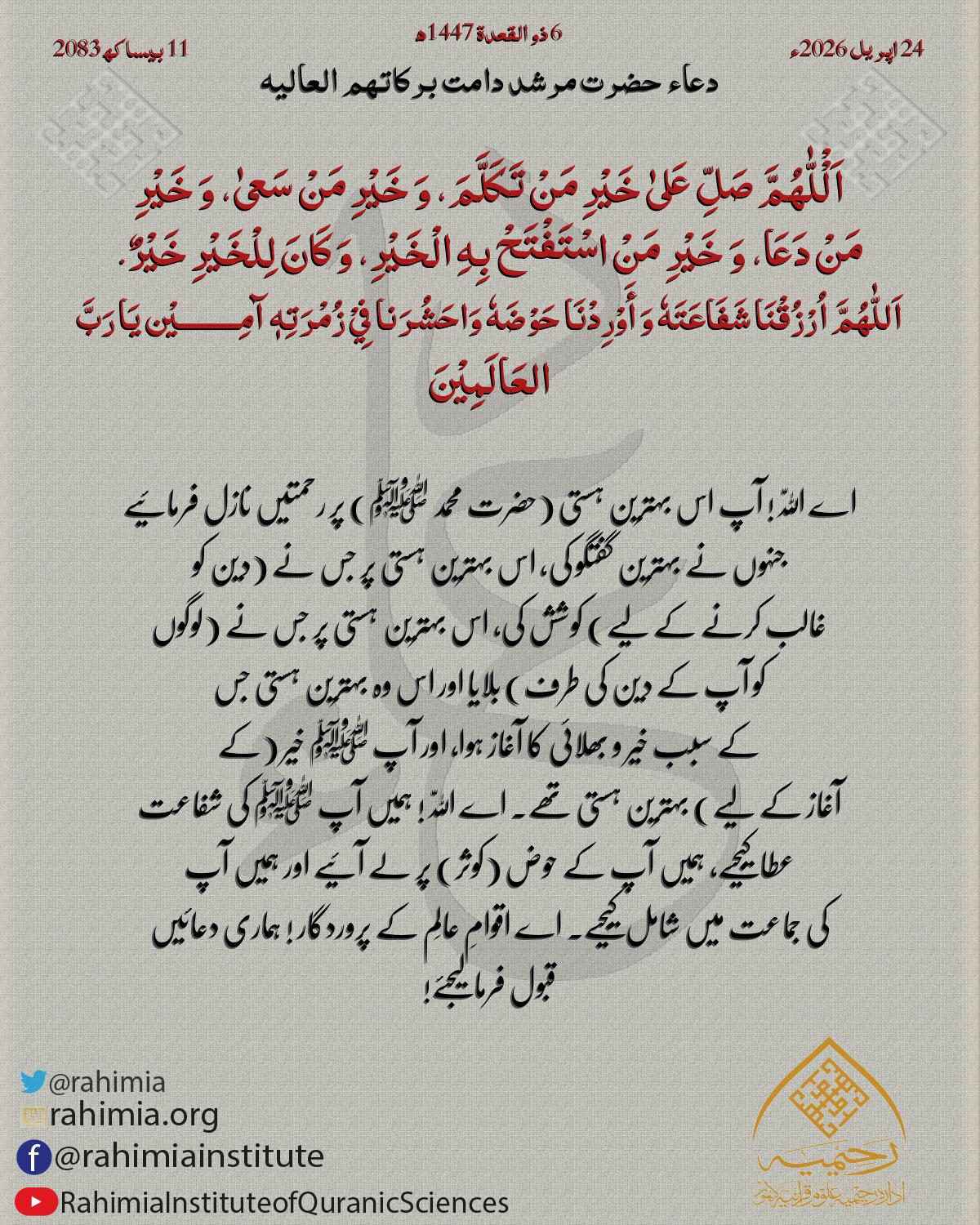 اَلْْلّٰهُمَّ صَلِّ عَلیٰ خَیْرِ مَنْ تَکَلَّمَ، وَ خَیْرِ مَنْ سَعیٰ، وَ خَیْرِ مَنْ دَعَا، وَ خَیْرِ مَنْ اسْتَفْتَحْ بِهِ الْخَیْرِ، وَ کَانَ لِلْخَیْرِ خَیْرٌ. اَللّٰهُمَّ اُرْزُقْنَا شَفَاعَتَهٗ وَ أَوْرِدْنَ…