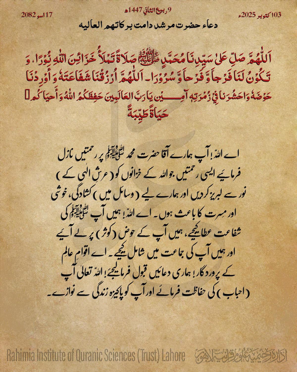 آپ ہمارے آقا حضرت محمد ﷺ پر رحمتیں نازل فرمائیے ایسی رحمتیں جو اللہ کے خزانوں کو (عرشِ الٰہی کے) نور سے لبریز کردیں اور ہمارے لیے (وسائل میں) کشادگی، خوشی اور مَسرت کا باعث ہوں۔
