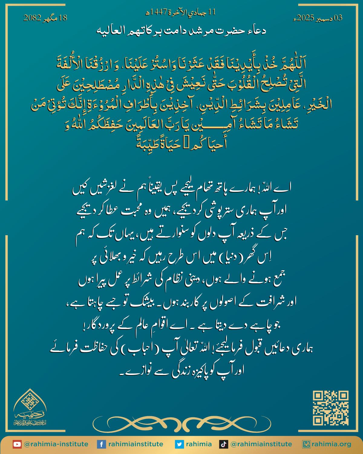 ہمیں وہ محبت عطا کر دیجیے جس کے ذریعہ آپ دلوں کو سنوارتے ہیں، یہاں تک کہ ہم اِس گھر (دنیا) میں اس طرح رہیں کہ خیر و بھلائی پر جمع ہونے والے ہوں، دینی نظام کی شرائط پر عمل پیرا ہوں اور شرافت کے اصولوں پر کاربند ہوں۔