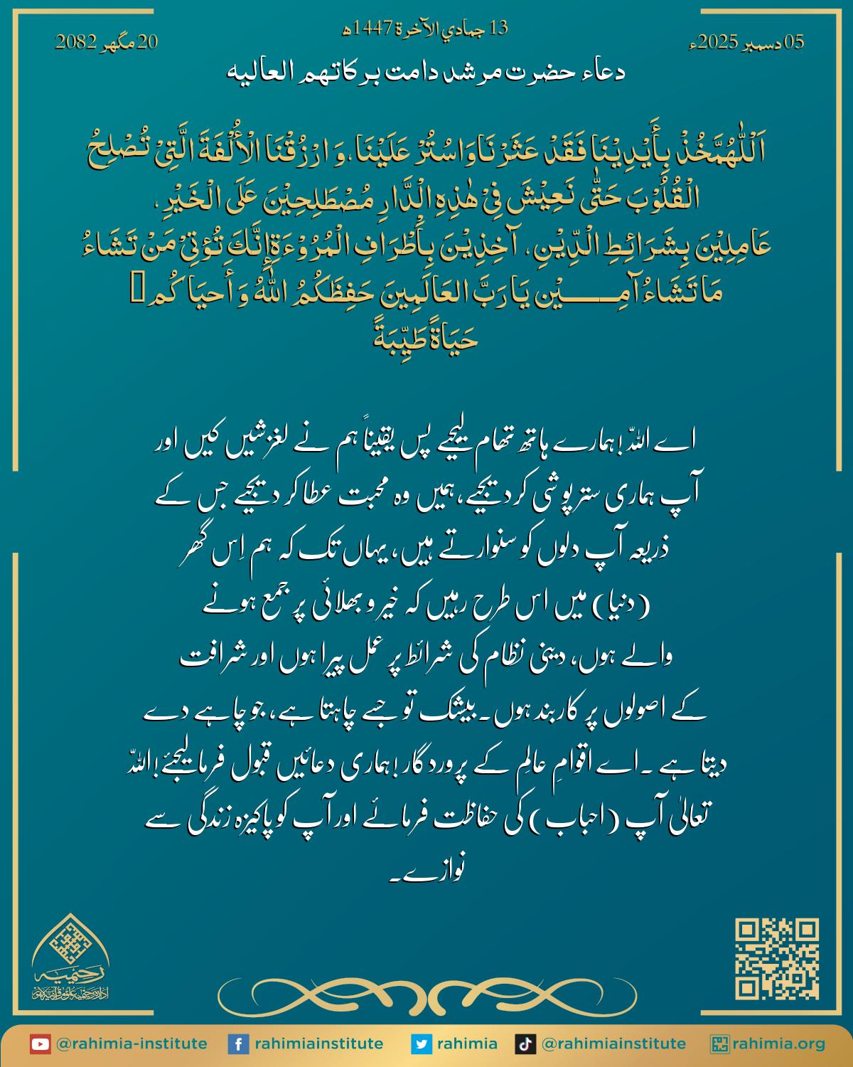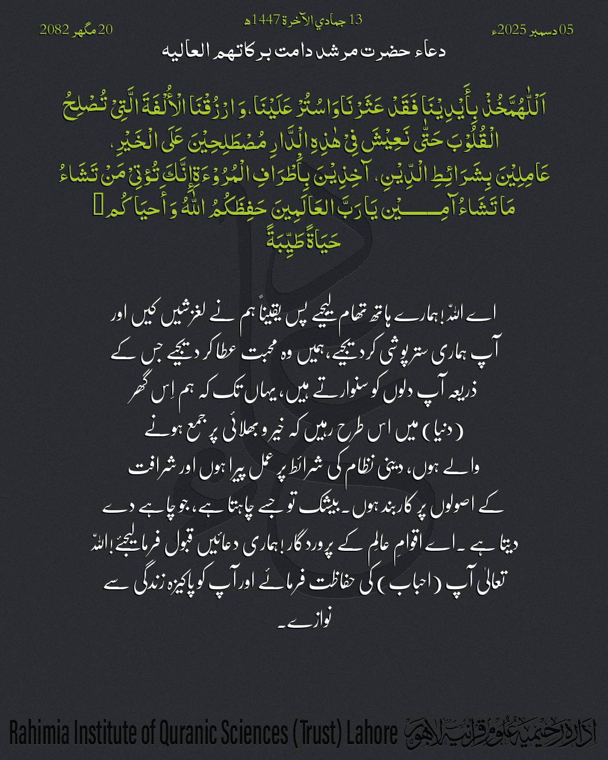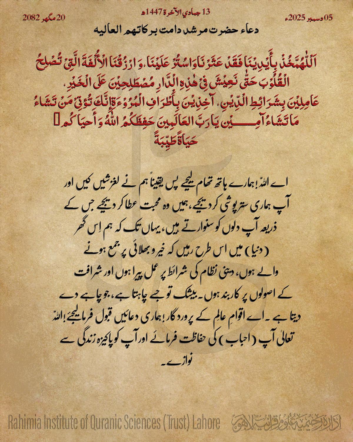 ہمیں وہ محبت عطا کر دیجیے جس کے ذریعہ آپ دلوں کو سنوارتے ہیں، یہاں تک کہ ہم اِس گھر (دنیا) میں اس طرح رہیں کہ خیر و بھلائی پر جمع ہونے والے ہوں، دینی نظام کی شرائط پر عمل پیرا ہوں اور شرافت کے اصولوں پر کاربند ہوں۔