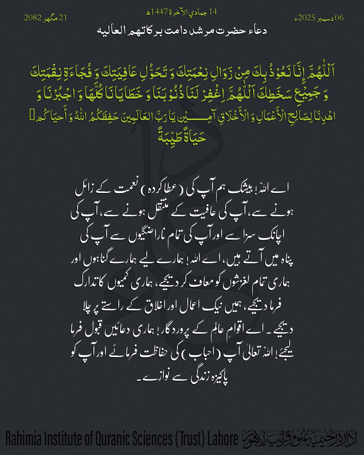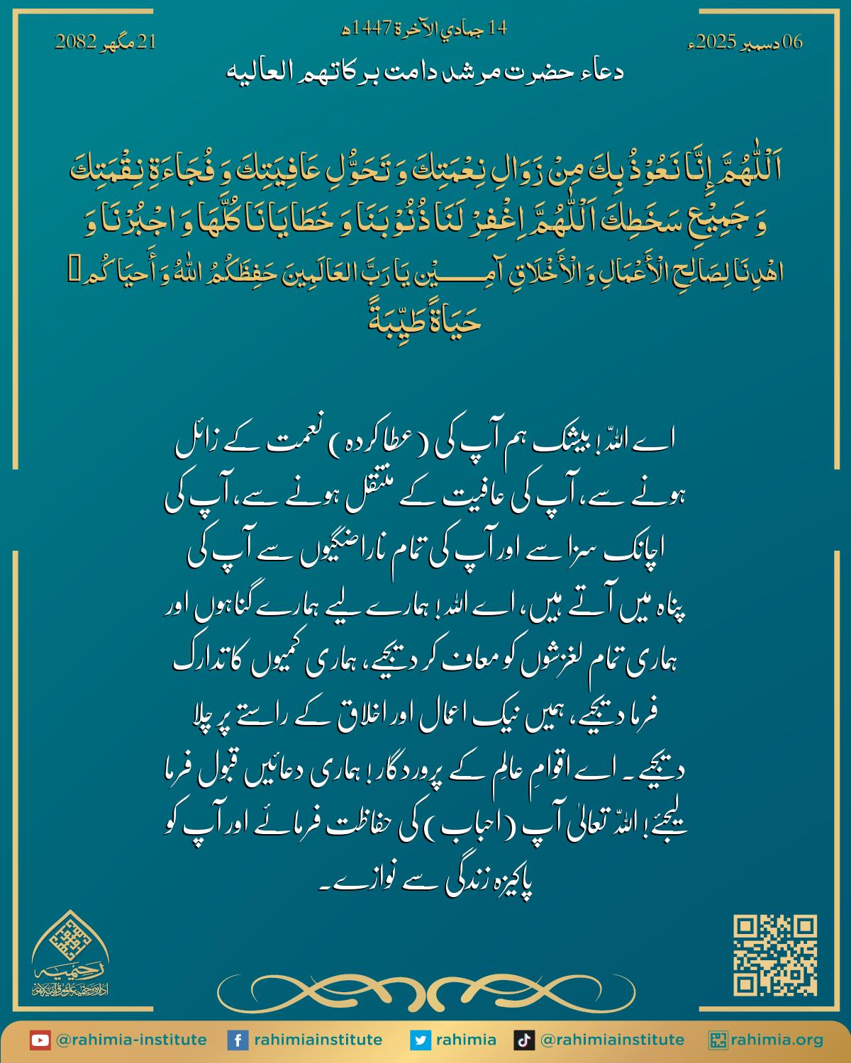 بیشک ہم آپ کی (عطا کردہ) نعمت کے زائل ہونے سے، آپ کی عافیت کے منتقل ہونے سے، آپ کی اچانک سزا سے اور آپ کی تمام ناراضگیوں سے آپ کی پناہ میں آتے ہیں،