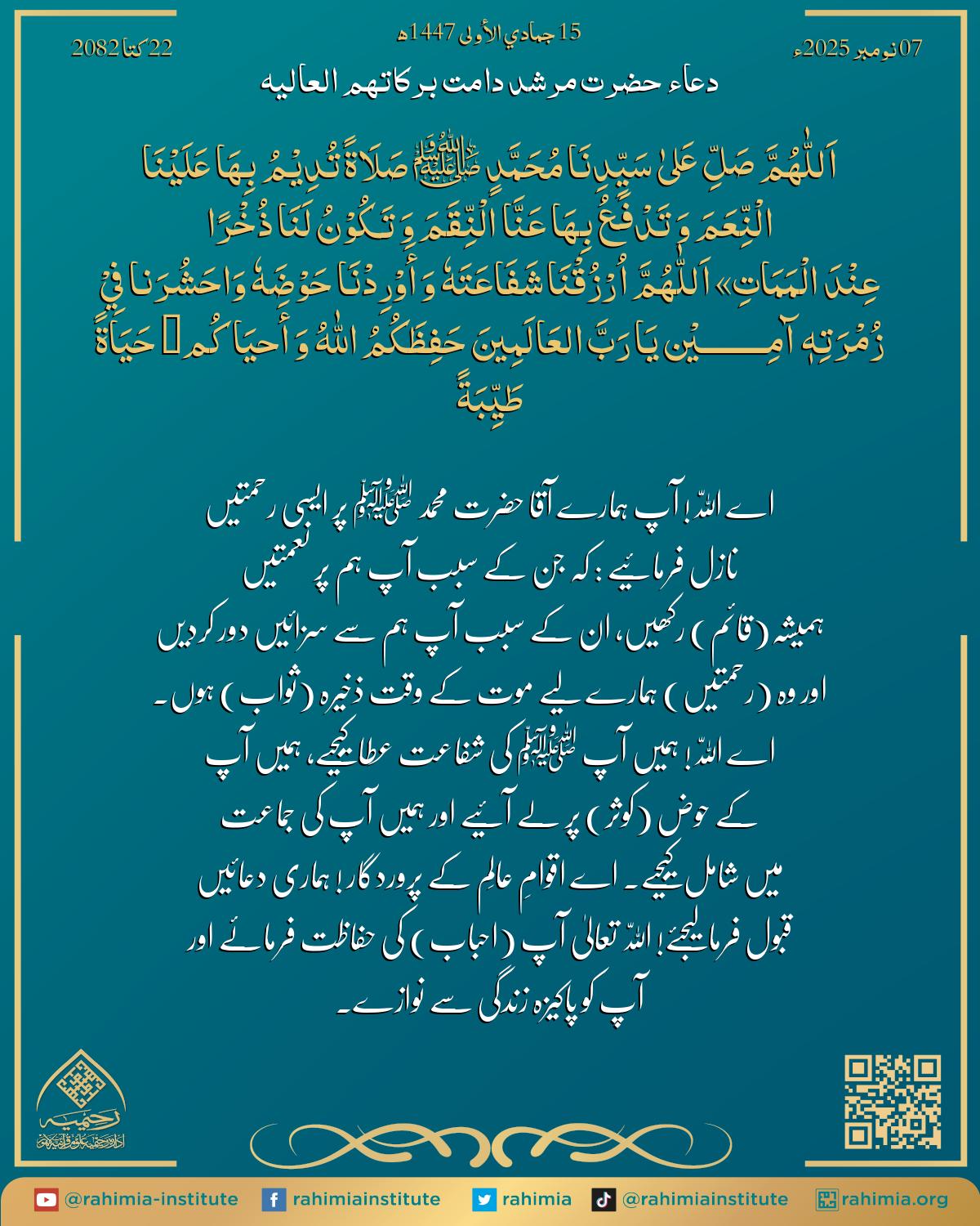 ہمیں آپ ﷺ کی شفاعت عطا کیجیے، ہمیں آپ کے حوض (کوثر) پر لے آئیے اور ہمیں آپ کی جماعت میں شامل کیجیے۔