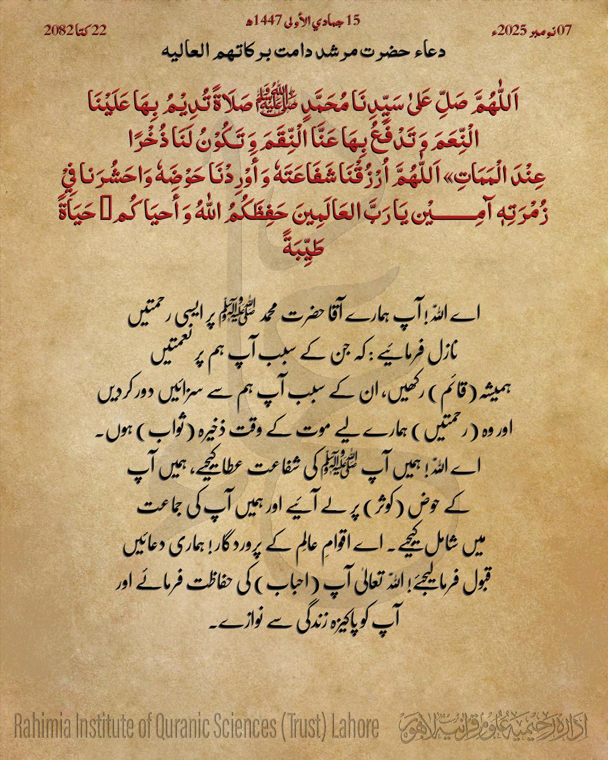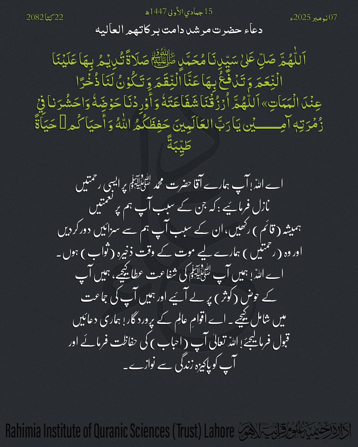 صَلِّ عَلیٰ سَیِّدِنَا مُحَمَّدٍ ﷺ صَلَاةً تُدِیْمُ بِھَا عَلَیْنَا الْنِّعَمَ وَ تَدْفَعُ بِھَا عَنَّا الْنِّقَمَ وَ تَکُوْنُ لَنَا ذُخْرًا عِنْدَ الْمَمَاتِ»