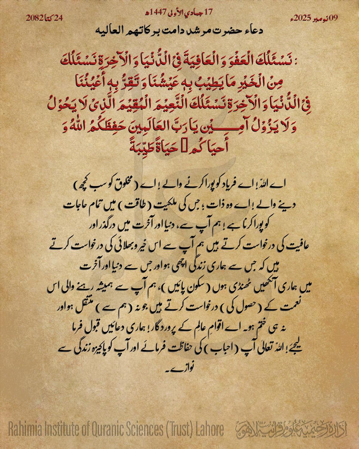 اے اللّٰہ! اے فریاد کو پورا کرنے والے ! اے (مخلوق کو سب کچھ) دینے والے ! اے وہ ذات ؛ جس کی ملکیت (طاقت) میں تمام حاجات کو پورا کرنا ہے ! ہم آپ سے، دنیا اور آخرت میں درگذر اور عافیت کی درخواست کرتے ہیں ہم آپ سے اس خیر وبھلائی کی درخواست کرتے ہیں کہ جس سے ہماری زندگی اچھی ہو اور جس سے دنیا اور آخرت میں ہماری آنکھیں ٹھنڈی ہوں (سکون پائیں)، ہم آپ سے ہمیشہ رہنے والی اس نعمت کے (حصول کی) درخواست کرتے ہیں جو نہ (ہم سے) منتقل ہو اور نہ ہی ختم ہو۔ اے اقوامِ عالَم کے پروردگار ! ہماری دعائیں قبول فرما لیجئے! اللّٰہ تعالیٰ آپ (احباب) کی حفاظت فرمائے اور آپ کو پاکیزہ زندگی سے نوازے۔