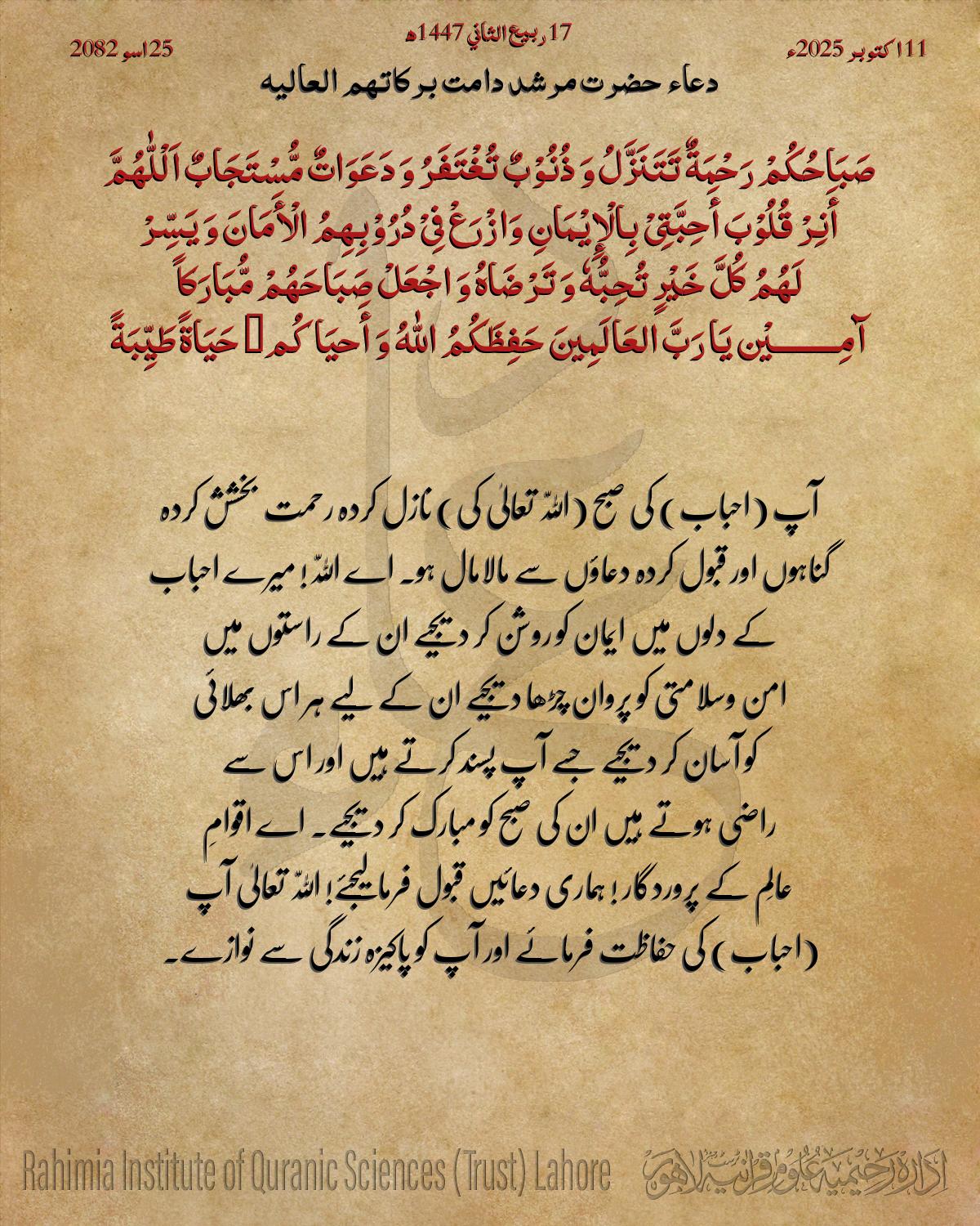 آپ (احباب) کی صبح (اللّٰہ تعالیٰ کی) نازل کردہ رحمت بخشش کردہ گناہوں اور قبول کردہ دعاؤں سے مالامال ہو۔
