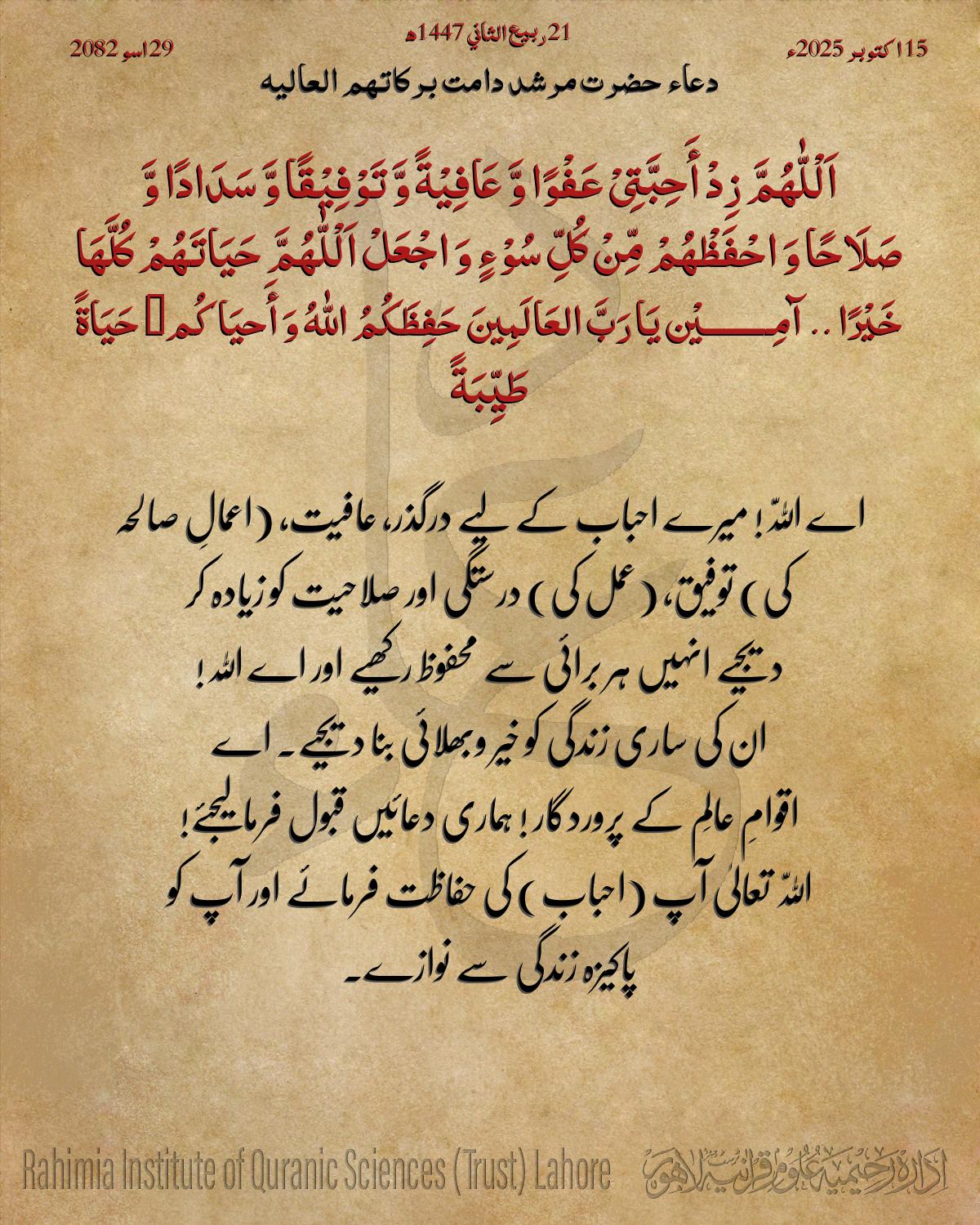 اللّٰہ تعالیٰ آپ (احباب) کی حفاظت فرمائے اور آپ کو پاکیزہ زندگی سے نوازے۔