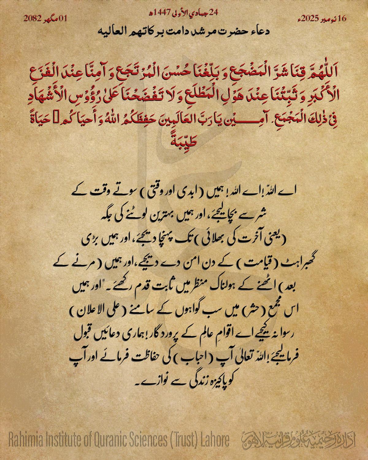 اے اللہ! ہمیں (ابدی اور وقتی) سوتے وقت کے شر سے بچا لیجئے، اور ہمیں بہترین لوٹنے کی جگہ (یعنی آخرت کی بھلائی) تک پہنچا دیجئے، اور ہمیں بڑی گھبراہٹ (قیامت) کے دن امن دے دیجیے ،
