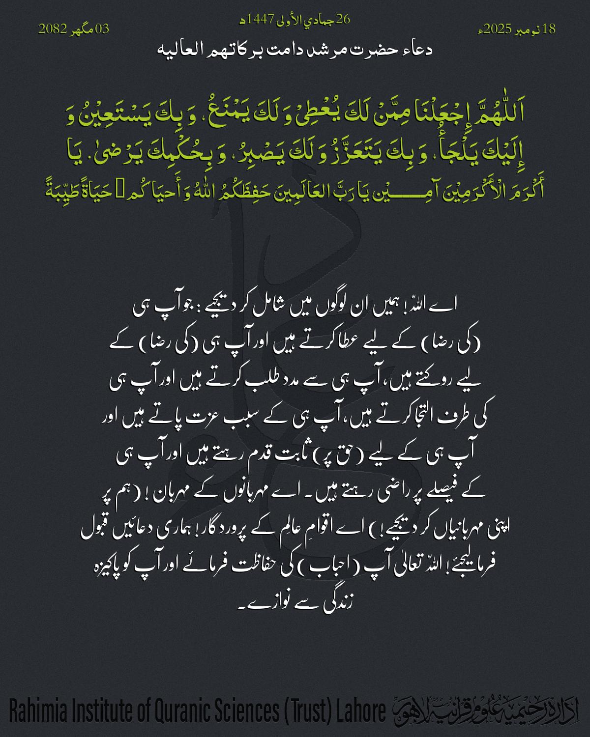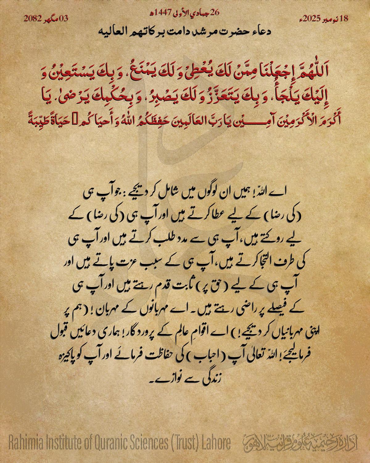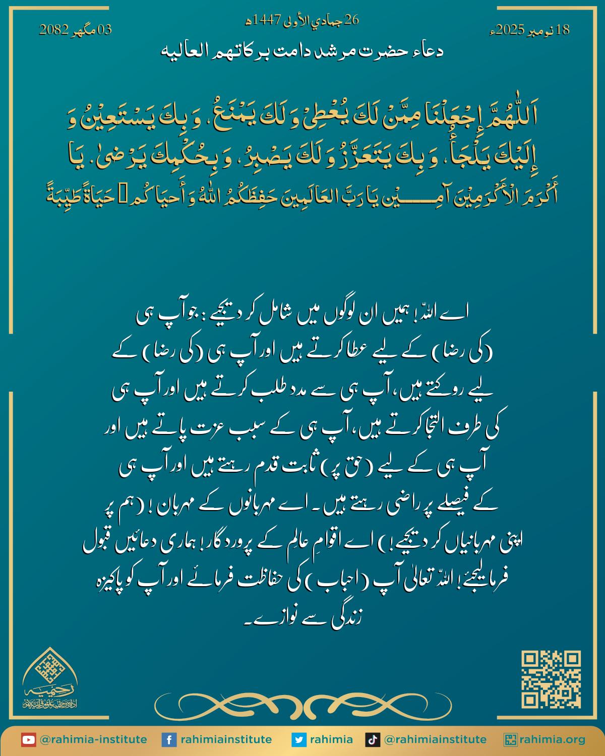 إِجْعَلْنَا مِمَّنْ لَكَ یُعْطِیْ وَ لَكَ یَمْنَعُ، وَ بِكَ یَسْتَعِیْنُ وَ إِلَیْكَ یَلْجَأُ، وَ بِكَ یَتَعَزَّزُ وَ لَكَ یَصْبِرُ، وَ بِحُکْمِكَ یَرْضیٰ.