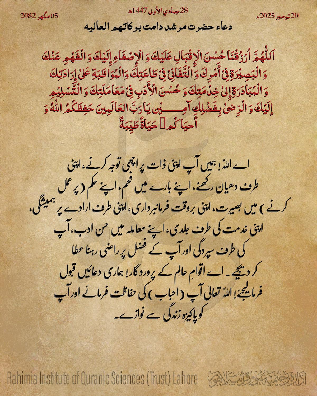ہمیں آپ اپنی ذات پر اچھی توجہ کرنے، اپنی طرف دھیان رکھنے، اپنے بارے میں فھم، اپنے حکم (پر عمل کرنے) میں بصیرت، اپنی بروقت فرمانبرداری، اپنی طرف ارادے پر ہمیشگی، اپنی خدمت کی طرف جلدی، اپنے معاملہ میں حسن ادب، آپ کی طرف سپردگی اور آپ کے فضل پر راضی رہنا عطا کر دیجیے۔