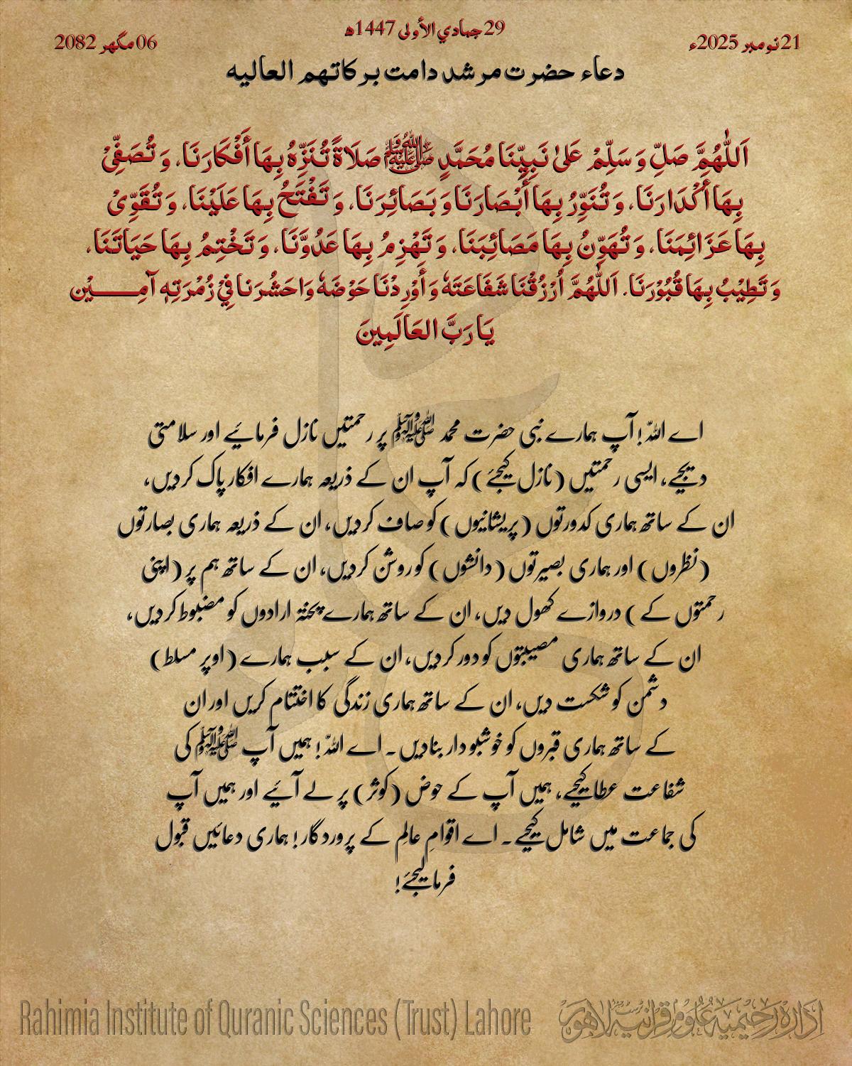ایسی رحمتیں (نازل کیجئے) کہ آپ ان کے ذریعہ ہمارے افکار پاک کردیں، ان کے ساتھ ہماری کدورتوں (پریشانیوں) کو صاف کردیں، ان کے ذریعہ ہماری بصارتوں (نظروں) اور ہماری بصیرتوں (دانشوں) کو روشن کردیں، ان کے ساتھ ہم پر (اپنی رحمتوں کے) دروازے کھول دیں، ان کے ساتھ ہمارے پختہ ارادوں کو مضبوط کردیں، ان کے ساتھ ہماری مصیبتوں کو دور کردیں، ان کے سبب ہمارے (اوپر مسلط) دشمن کو شکست دیں، ان کے ساتھ ہماری زندگی کا اختتام کریں اور ان کے ساتھ ہماری قبروں کو خوشبو دار بنادیں۔