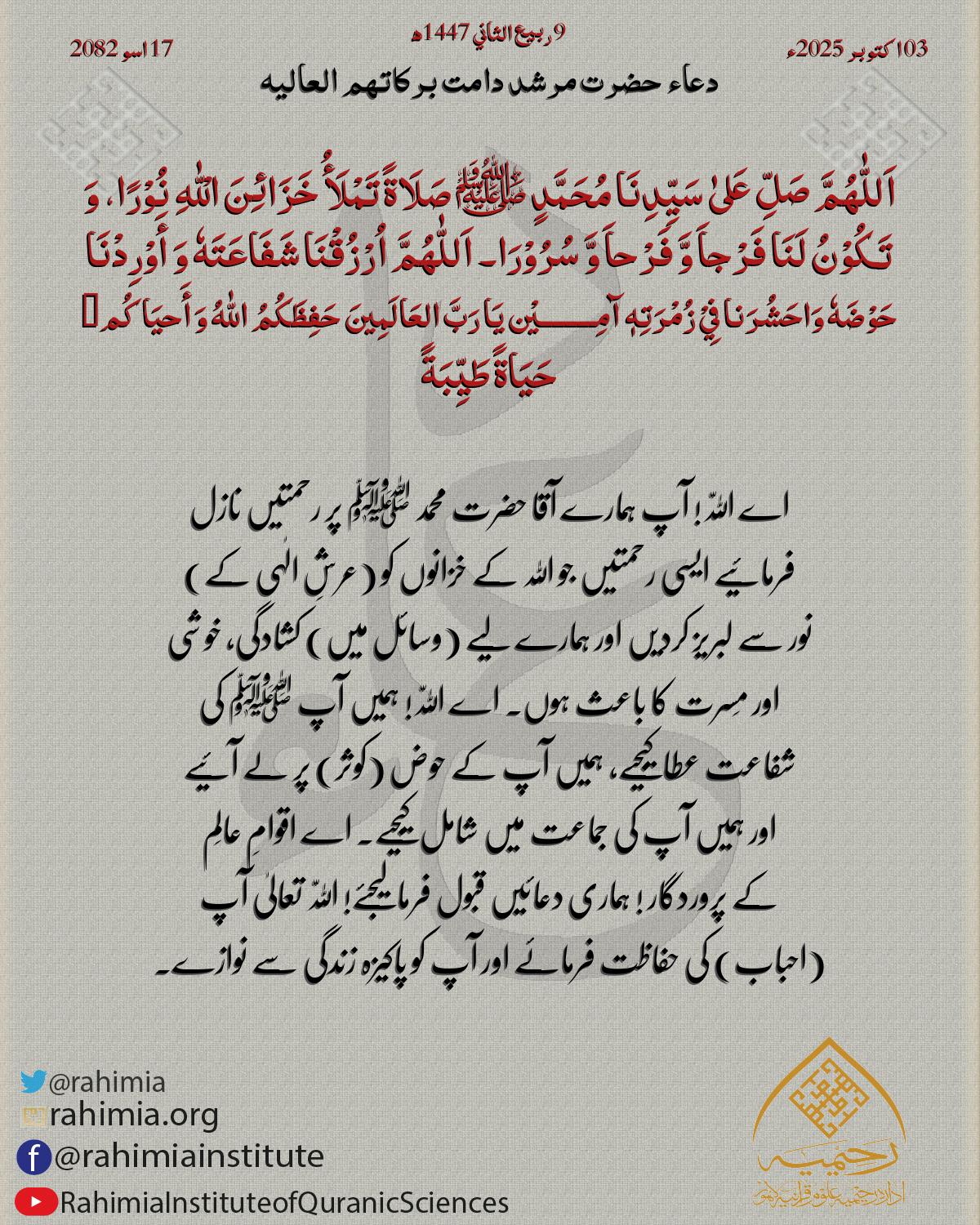 اَللّٰهُمَّ صَلِّ عَلیٰ سَیِّدِنَا مُحَمَّدٍ ﷺ صَلَاةً تَمْلَأُ خَزَائِنَ الْلّٰهِ نُوْرًا، وَ تَکُوْنُ لَنَا فَرْجاَ وَّ فَرْحاَ وَّ سُرُوْرَا۔ اَللّٰهُمَّ اُرْزُقْنَا شَفَاعَتَهٗ وَ أَوْرِدْنَا حَوْضَهٗ وَاحَشُرَن…