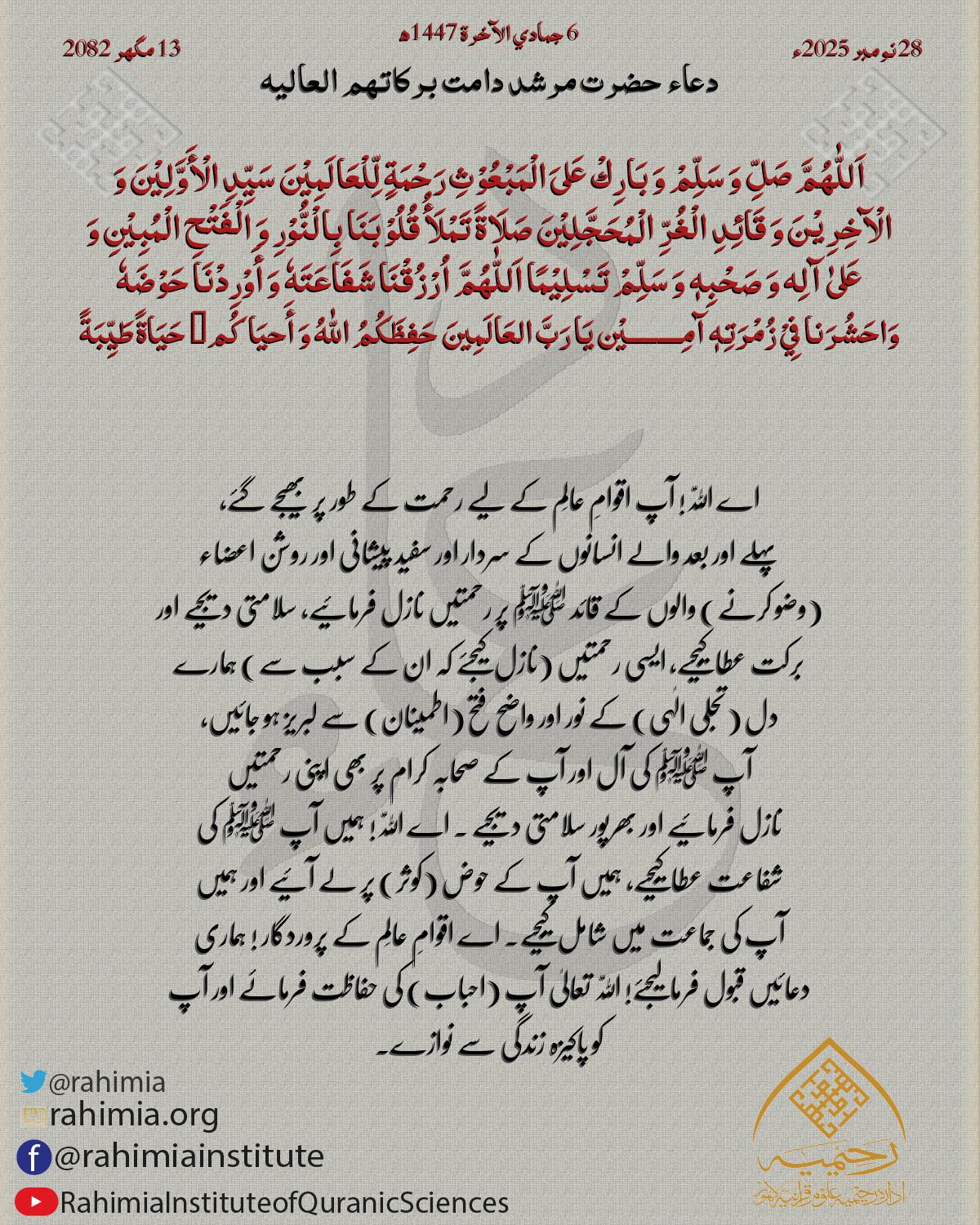 اَللّٰهُمَّ اِجْعَلْنَا مِمَّنْ یَّقْصِد إِلَیْكَ قَصْدَ مَنْ لَا رُجُوْعَ لَهٗ إِلَّا إِلَیْكَ اَللّٰهُمَّ اِجْعَلْ رَضَانَا بِحُکْمِكَ فِیْمَا اِبْتَلَیْتَنَا فِیْ کُلِّ وَقْتٍ مُّتَّصِلاً غَیْرَ مُنْفَصِلٍ اَللّٰهُمَّ وَ…