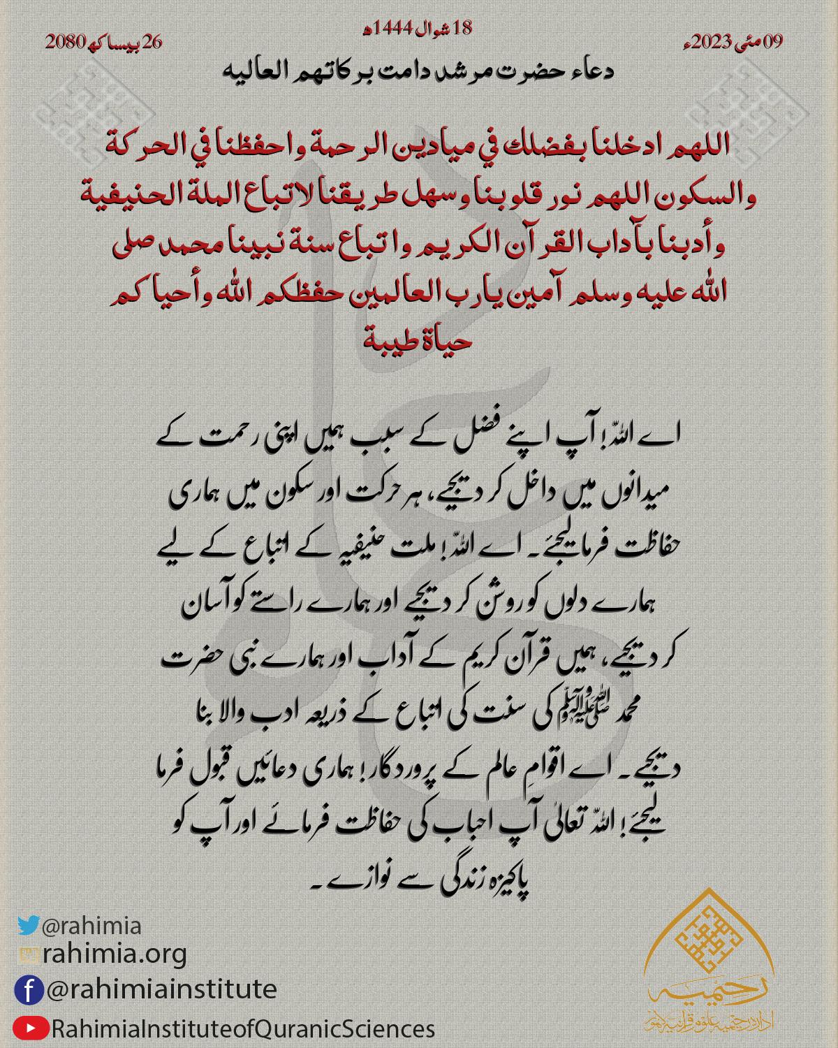 اللهم ادخلنا بفضلك في ميادين الرحمة واحفظنا في الحركة والسكون اللهم نور قلوبنا وسهل طريقنا لاتباع الملة الحنيفية وأدبنا بآ…