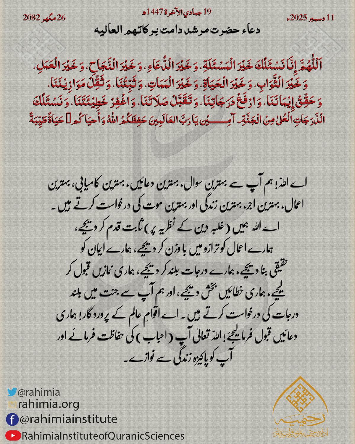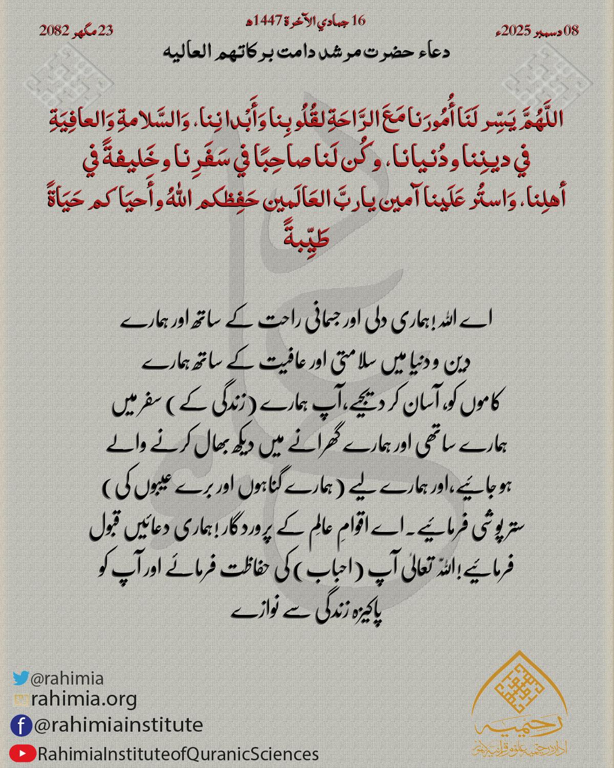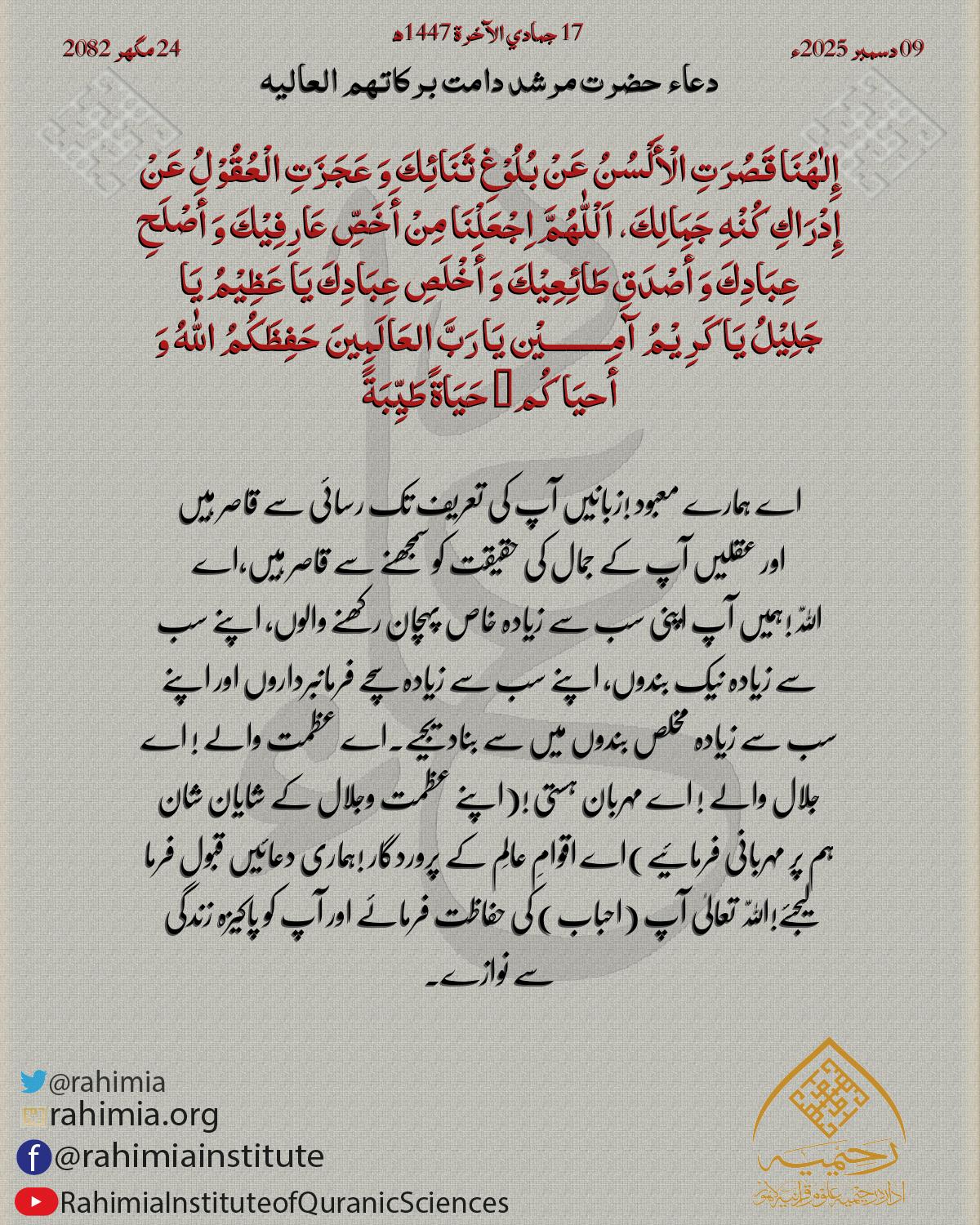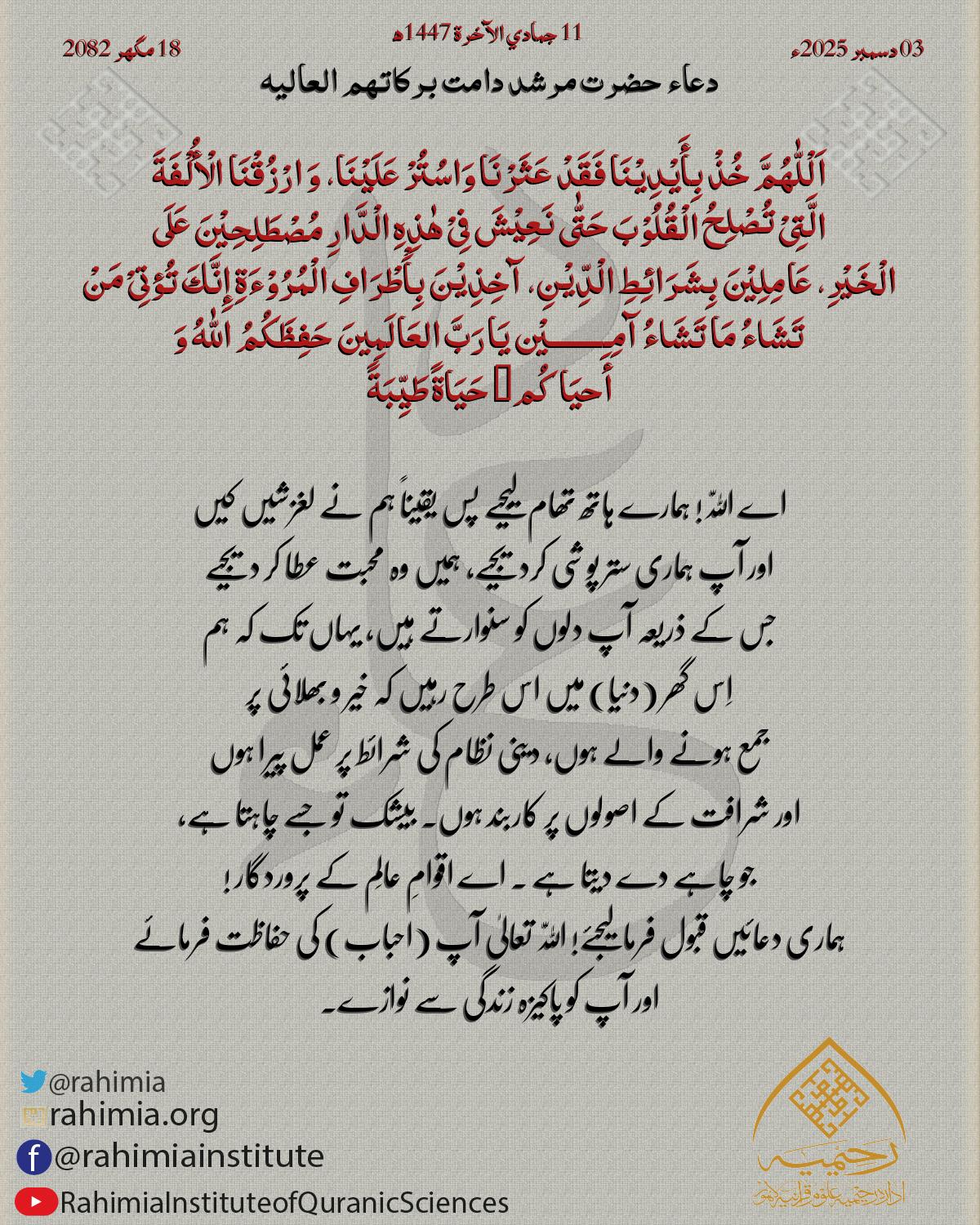 اَلْلّٰهُمَّ اُنْظُرْإِلَیْنَا نَظْرَةَ الْرِّضیٰ وَامْحُنَا مِنْ دِیْوَانِ أَھْلِ الْجَفَاءِ وَأَثْبِتْنَا فِیْ دِیْوَانِ أَھْلِ الْصَّفَاءِ وَ ارْزُقْنَا حُسْنَ الْرِّضَا وَ الْقَنَاعَةَ آمِـــــــــيْ…