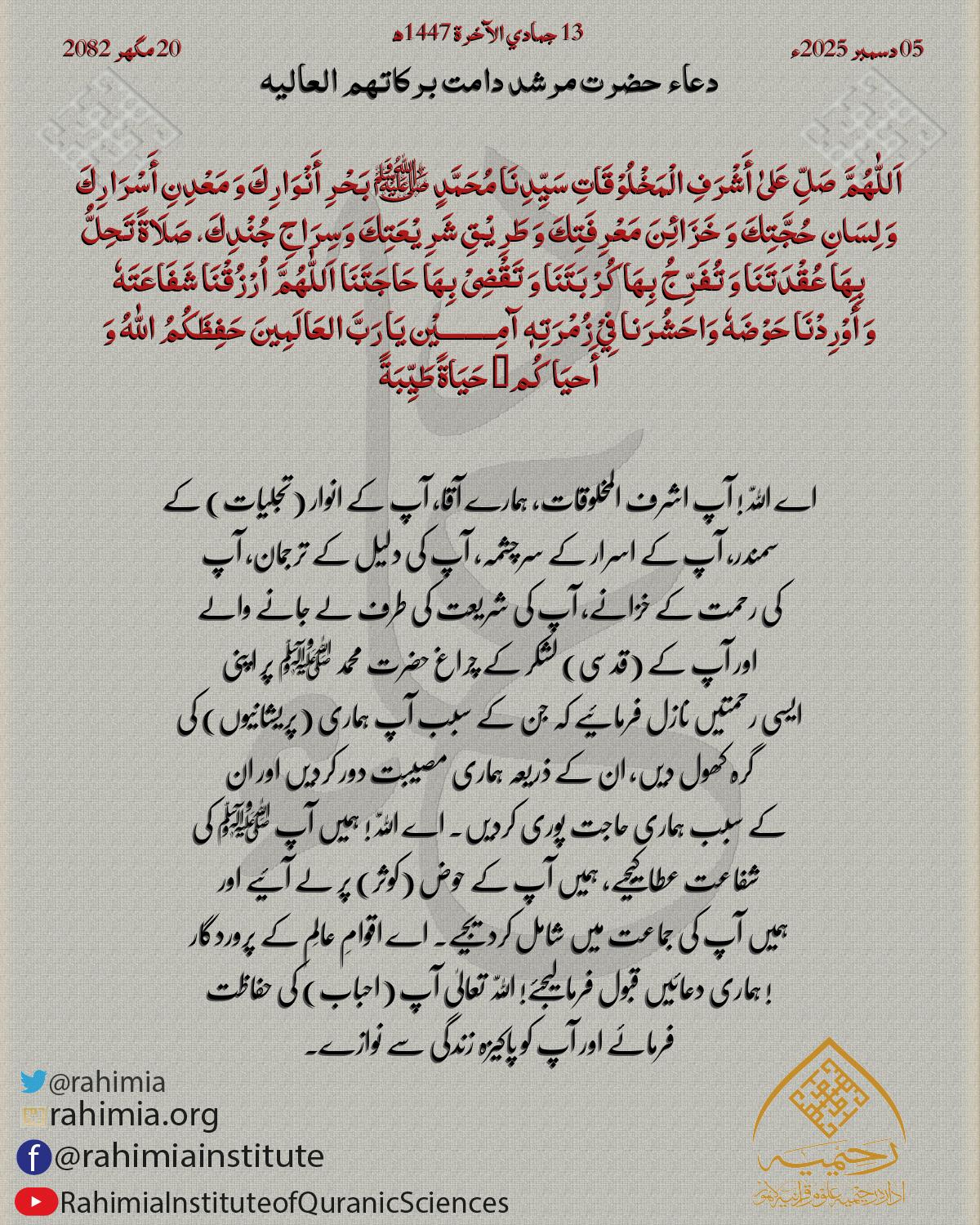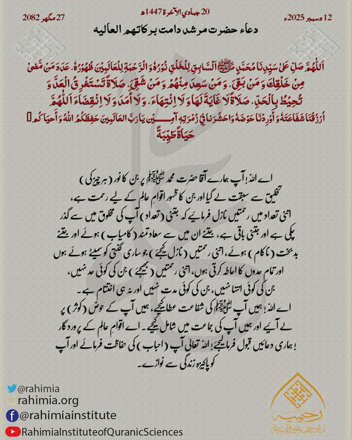 اَللّٰهُمَّ صَلِّ عَلیٰ سَیِّدِنَا مُحَمَّدٍ ﷺ اَلْسَّابِقِ لِلْخَلْقِ نُوْرُهٗ وَ الْرَّحْمَةِ لِلْعَالَمِیْنَ ظُھُوْرُهٗ، عَدَدَ مَنْ مَّضیٰ مِنْ خَلْقِكَ وَ مَنْ بَقِیَ، وَ مَنْ سَعِدَ مِنْھُمْ وَ مَنْ شَقِیَ، صَلَاةً…