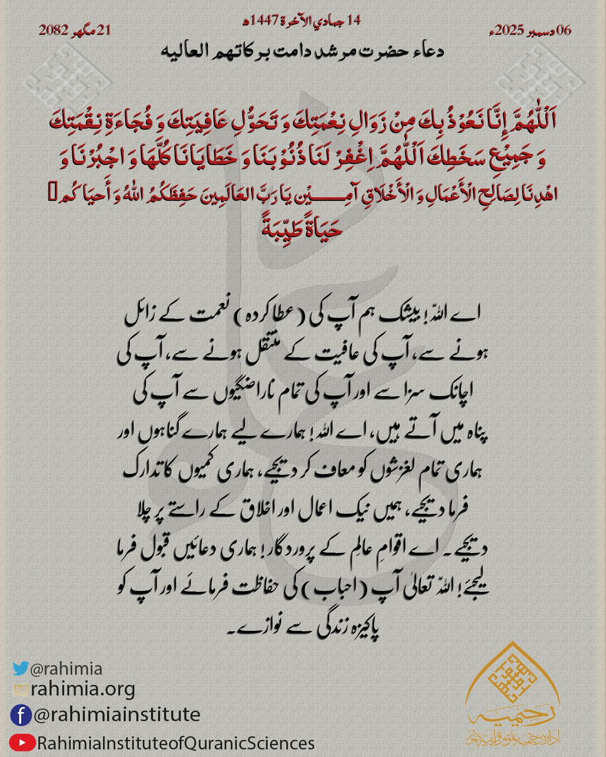 اَلْلّٰهُمَّ إِنَّا نَعُوْذُ بِكَ مِنْ زَوَالِ نِعْمَتِكَ وَ تَحَوُّلِ عَافِیَتِكَ وَ فُجَاءَةِ نِقْمَتِكَ وَ جَمِیْعِ سَخَطِكَ اَلْلّٰهُمَّ اِغْفِرْ لَنَا ذُنُوْبَنَا وَ خَطَایَانَا کُلَّھَا وَ اجْبُرْنَا وَ اھْدِ…