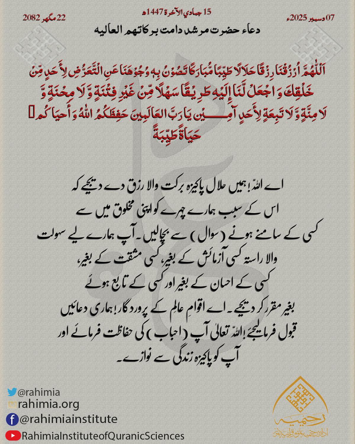 اَلْلّٰهُمَّ اُرْزُقْنَا رِزْقًا حَلَالًا طَیِّبًا مُّبَارَکًا تَصُوْنُ بِهٖ وُجُوْھَنَا عَنِ الْتَّعَرُّضِ لِأَ حَدٍ مِّنْ خَلْقِكَ وَ اجْعَلْ لَّنَا إِلَیْهِ طَرِیْقًا سَھْلًا مِّنْ غَیْرِ فِتْنَةٍ وَّ لَا مِحْنَةٍ وَّ …