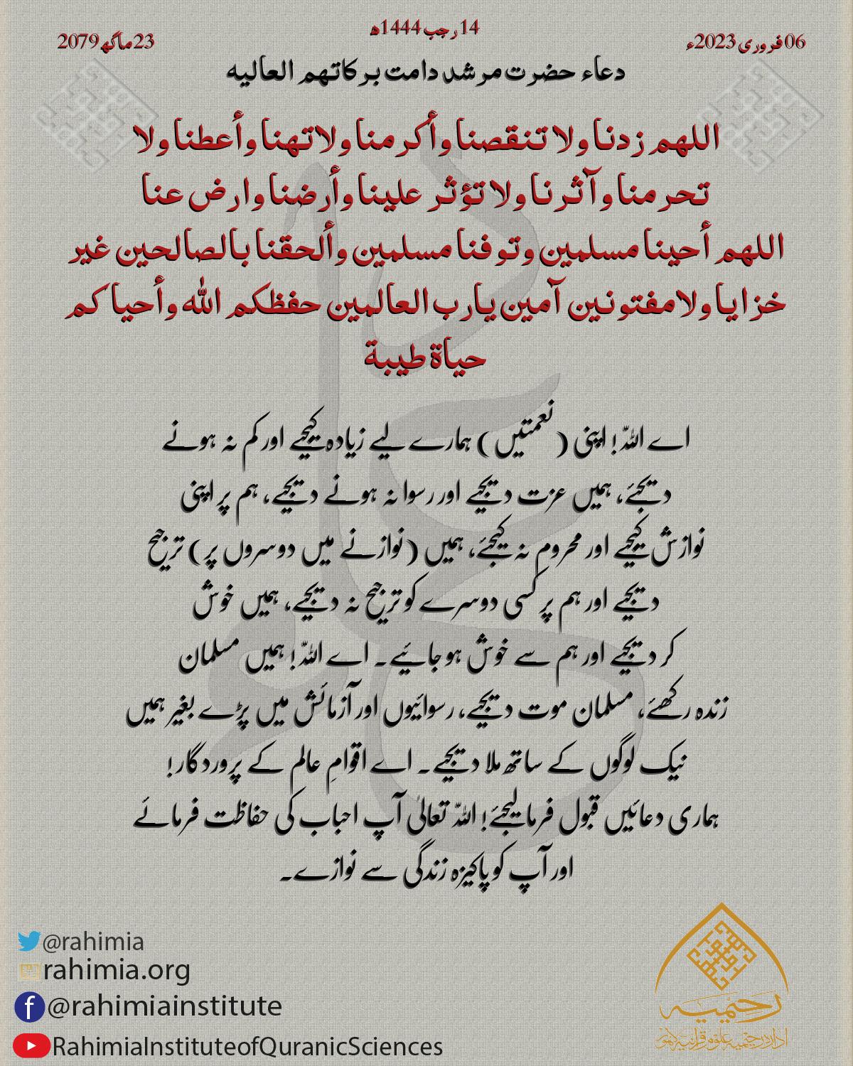 اللهم زدنا ولا تنقصنا وأكرمنا ولاتهنا وأعطنا ولا تحرمنا وآثرنا ولا تؤثر علينا وأرضنا وارض عنا اللهم أحينا مسلمين وتوفنا مسلم…