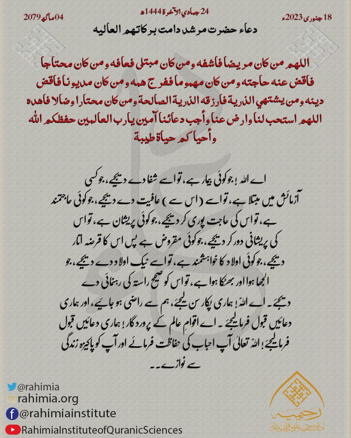 اللهم من كان مريضا فاشفه ومن كان مبتلى فعافه ومن كان محتاجا فاقض عنه حاجته ومن كان مهموما ففرج همه ومن كان مديونا فاقض دينه …