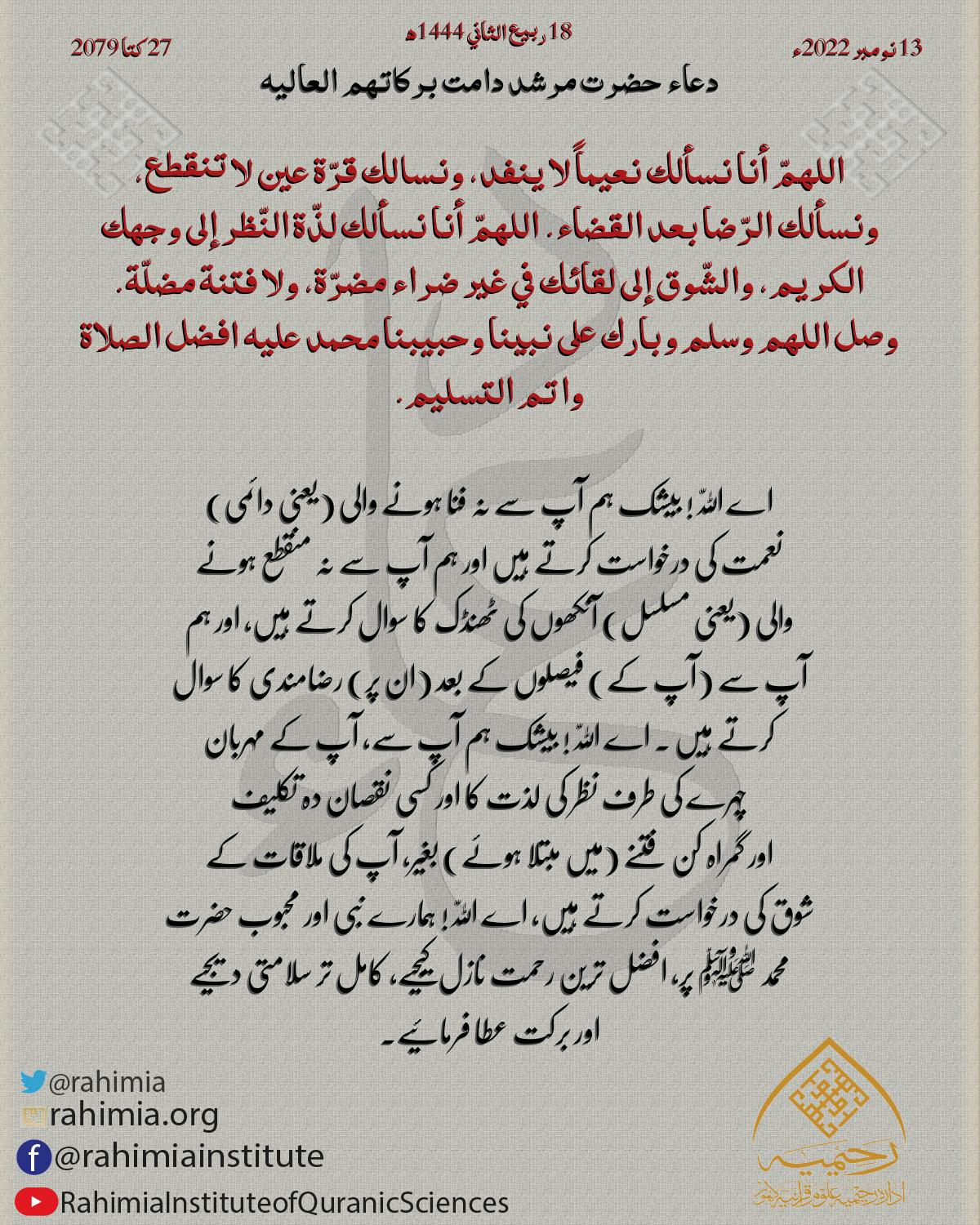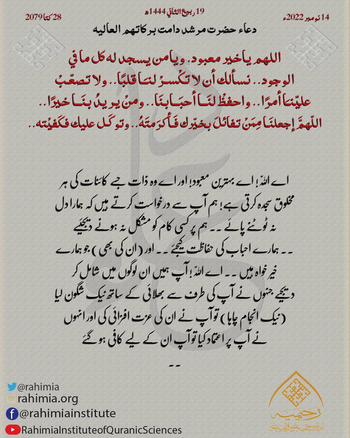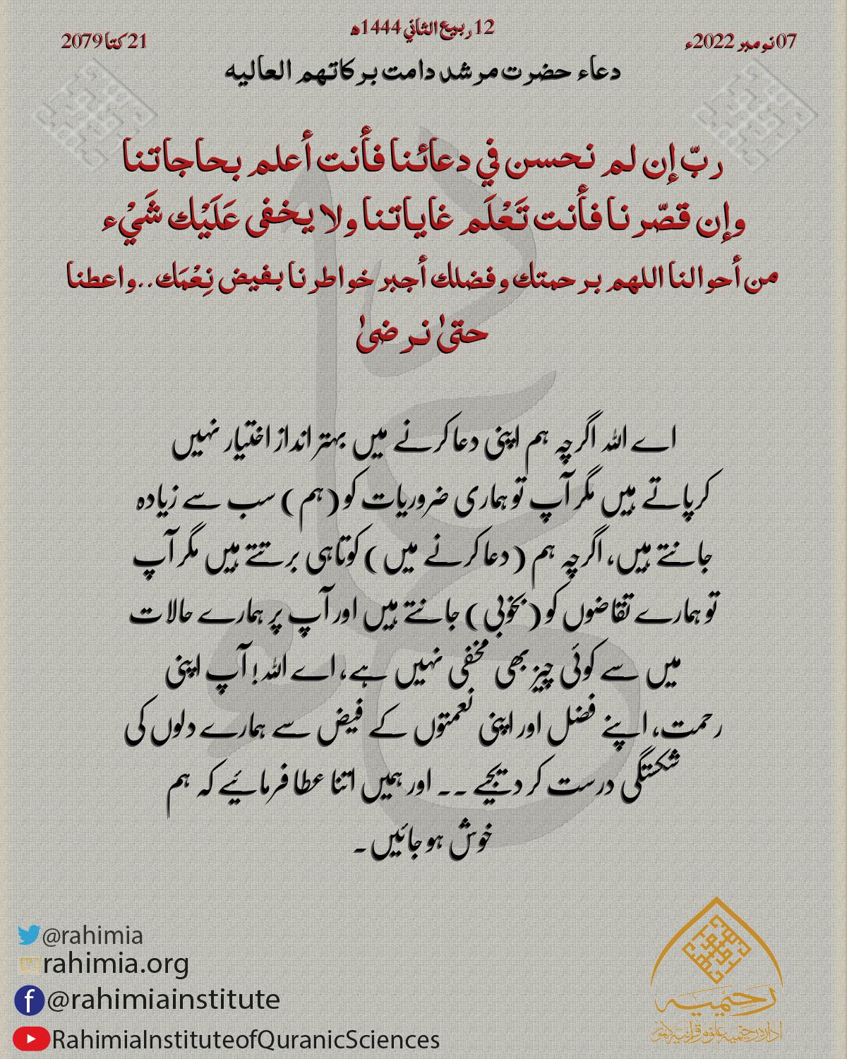 ربّ إن لم نحسن في دعائنا فأنت أعلم بحاجاتنا وإن قصّرنا فأنت تَعْلَم غاياتنا ولا يخفی عَلَيْك شَيْء من أحوالنا اللهم برحمتك وفضلك أجبر خوا…