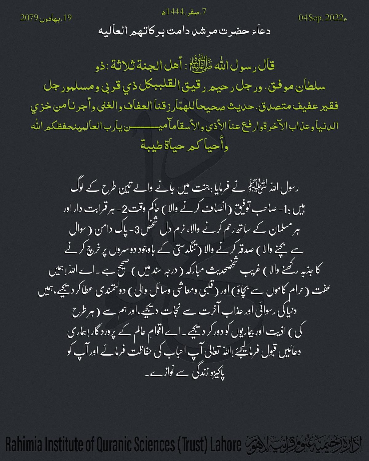 قال رسول الله ﷺ : أهل الجنة ثلاثة : ذو سلطان موفق، ورجل رحيم رقيق القلب بكل ذي قربى ومسلم ورجل فقير عفيف متصدق. حديث صح…