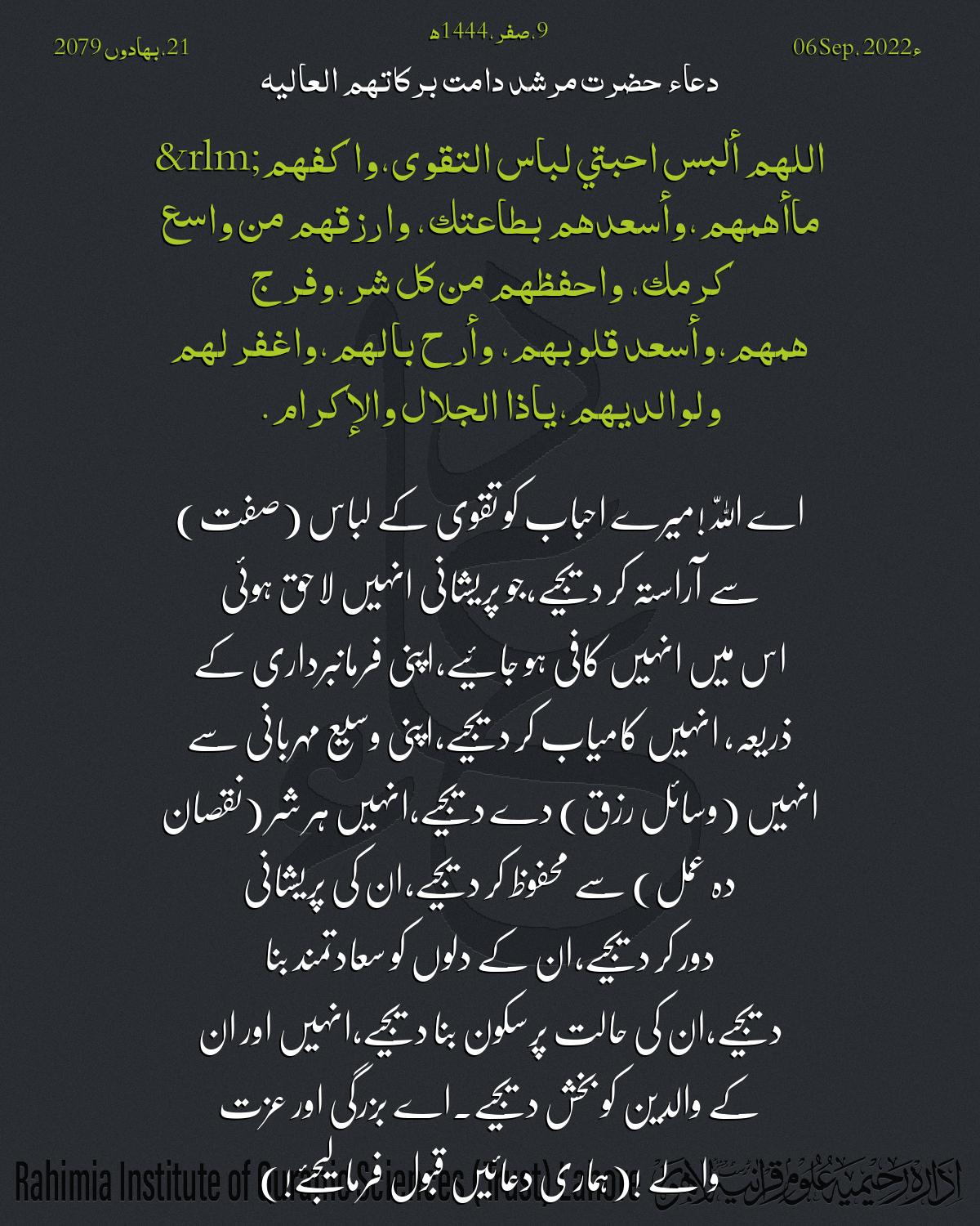 اللهم ألبس احبتي لباس التقوى، واكفهم ماأهمهم، وأسعدهم بطاعتك، وارزقهم من واسع كرمك، واحفظهم من كل شر ، وفرج همهم، …