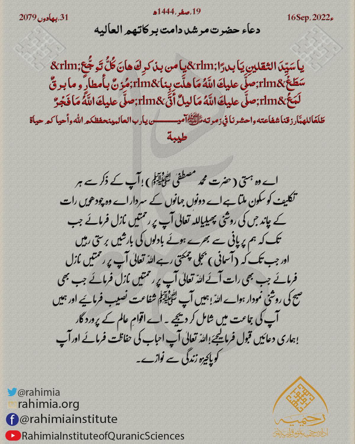 يا من بذكرِكَ هانَ كُلُّ تَوجُّعٍ يا سَيِّدَ الثقلينِ يَا بدرًا سَطَعْ صلَّى عليكَ اللَّهُ مَا هلَّت بِنا مُزنٌ بأمطارٍ و ما برقٌ لَمَعُ &rl…