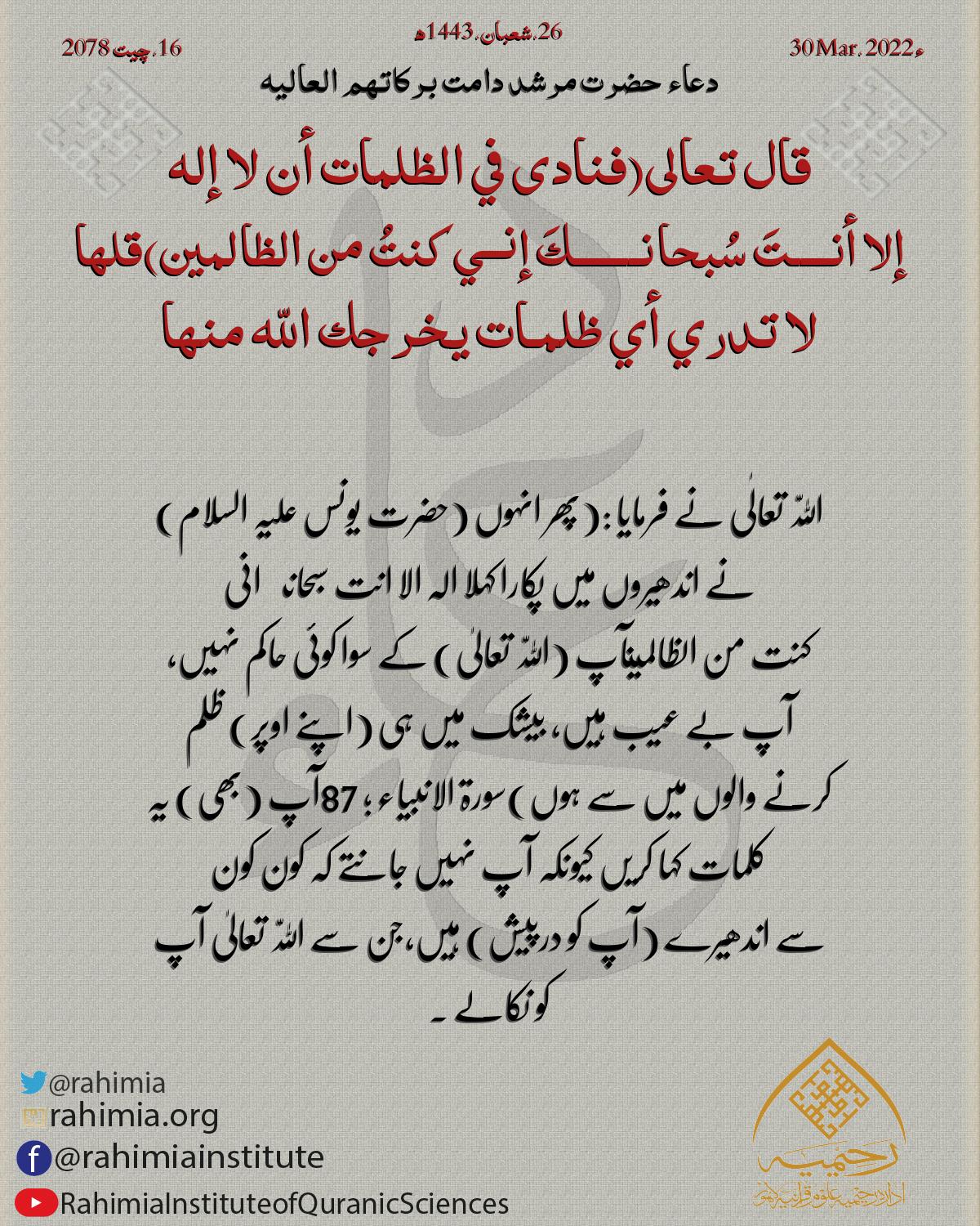 قال تعالى (فنادى في الظلمات أن لا إله إلا أنــــتَ سُبحانـــــــكَ إنــي كنتُ من الظالمين) قلها لا تدري أي ظلمـات يخرجك اللّه منها