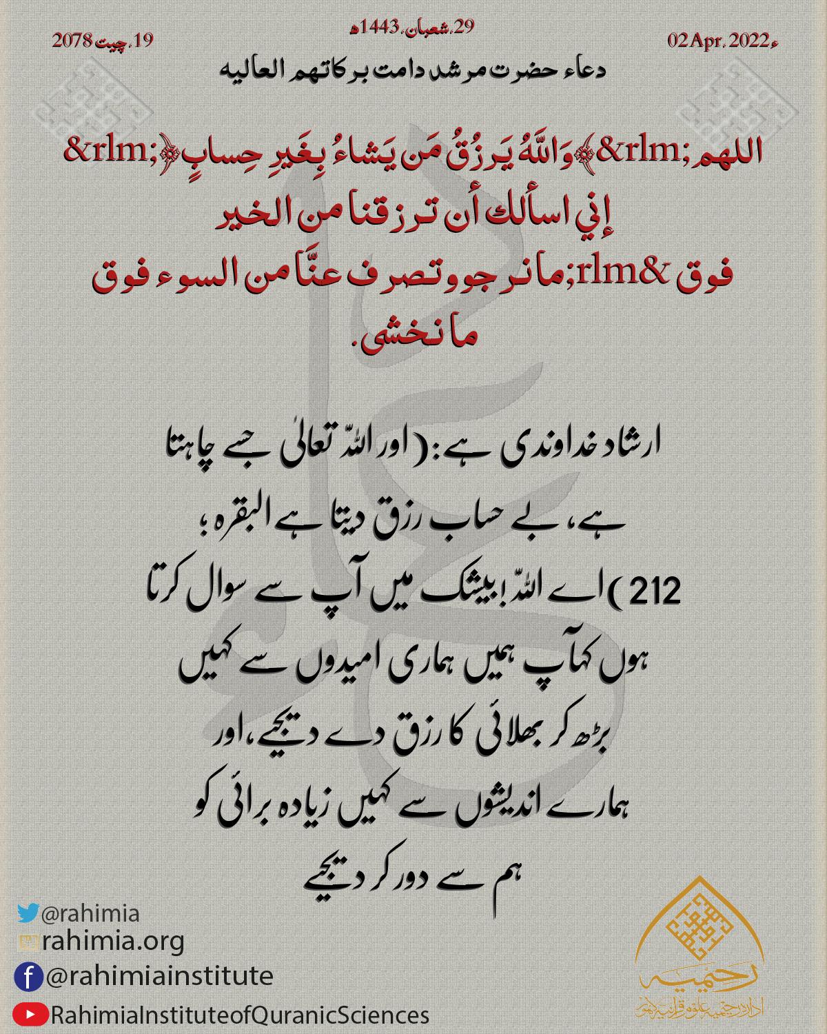 ﴿وَاللَّهُ يَرزُقُ مَن يَشاءُ بِغَيرِ حِسابٍ﴾ اللهم إني اسألك أن ترزقنا من الخير فوق مانرجو وتصرف عنَّا من السوء فوق ما نخشى.