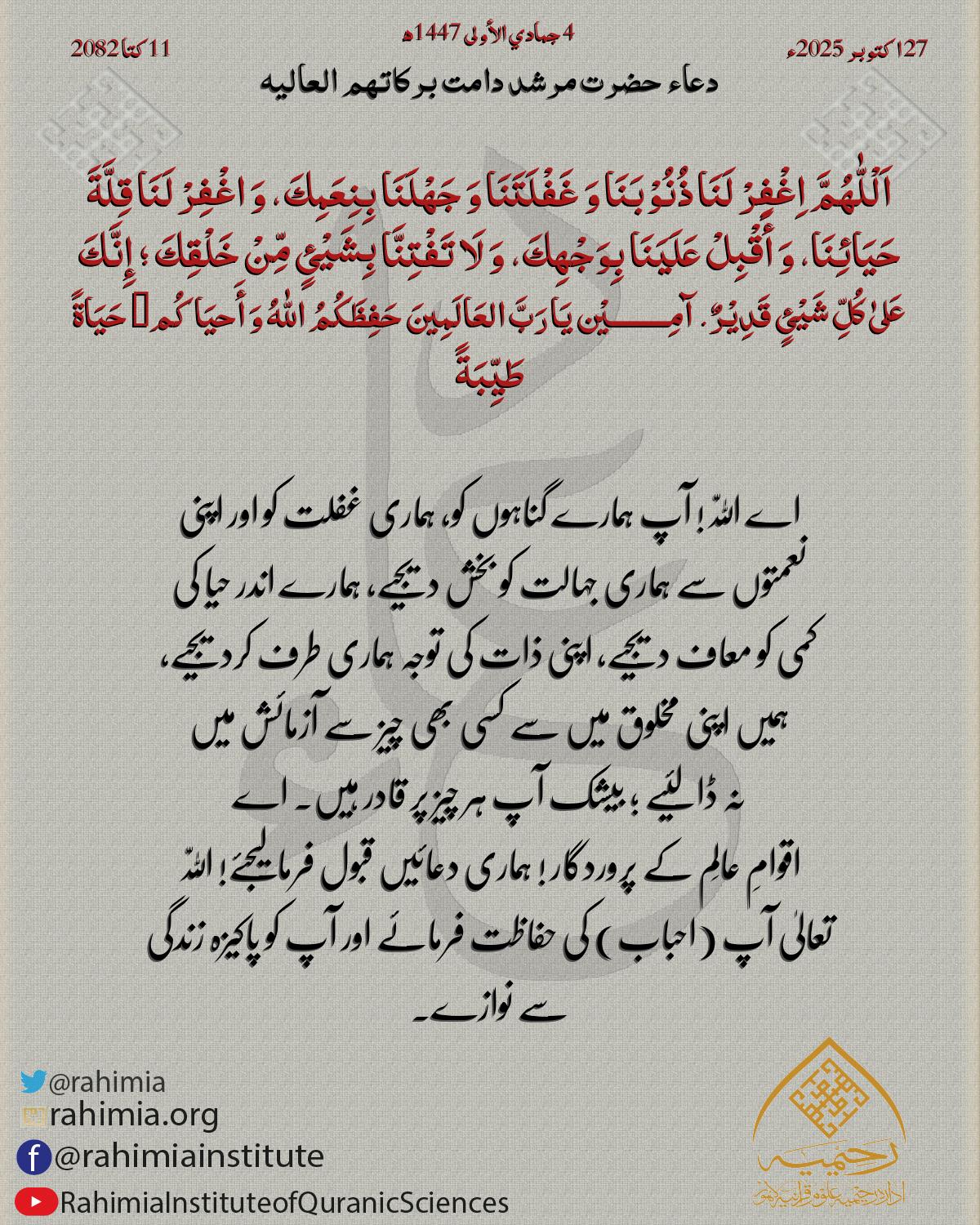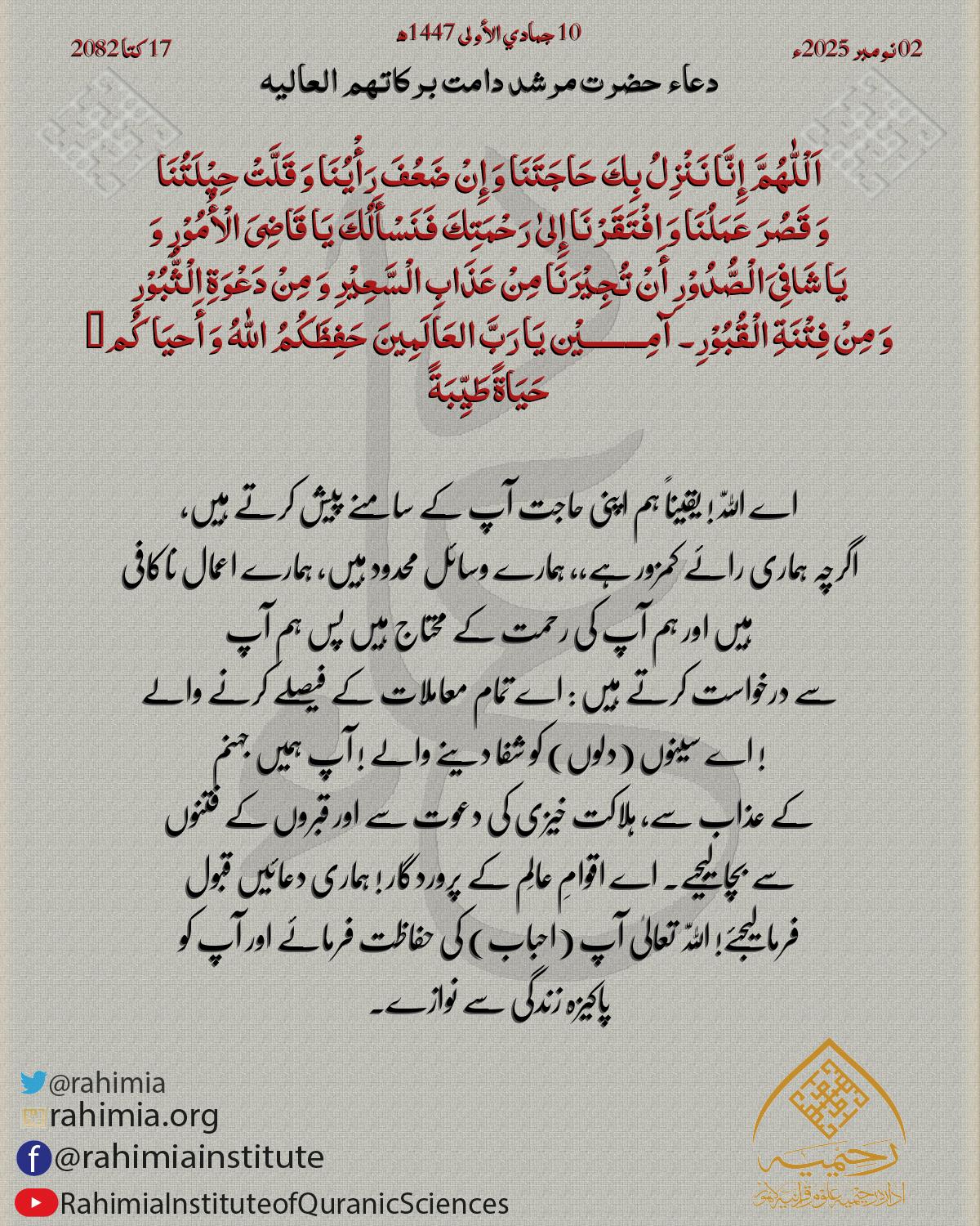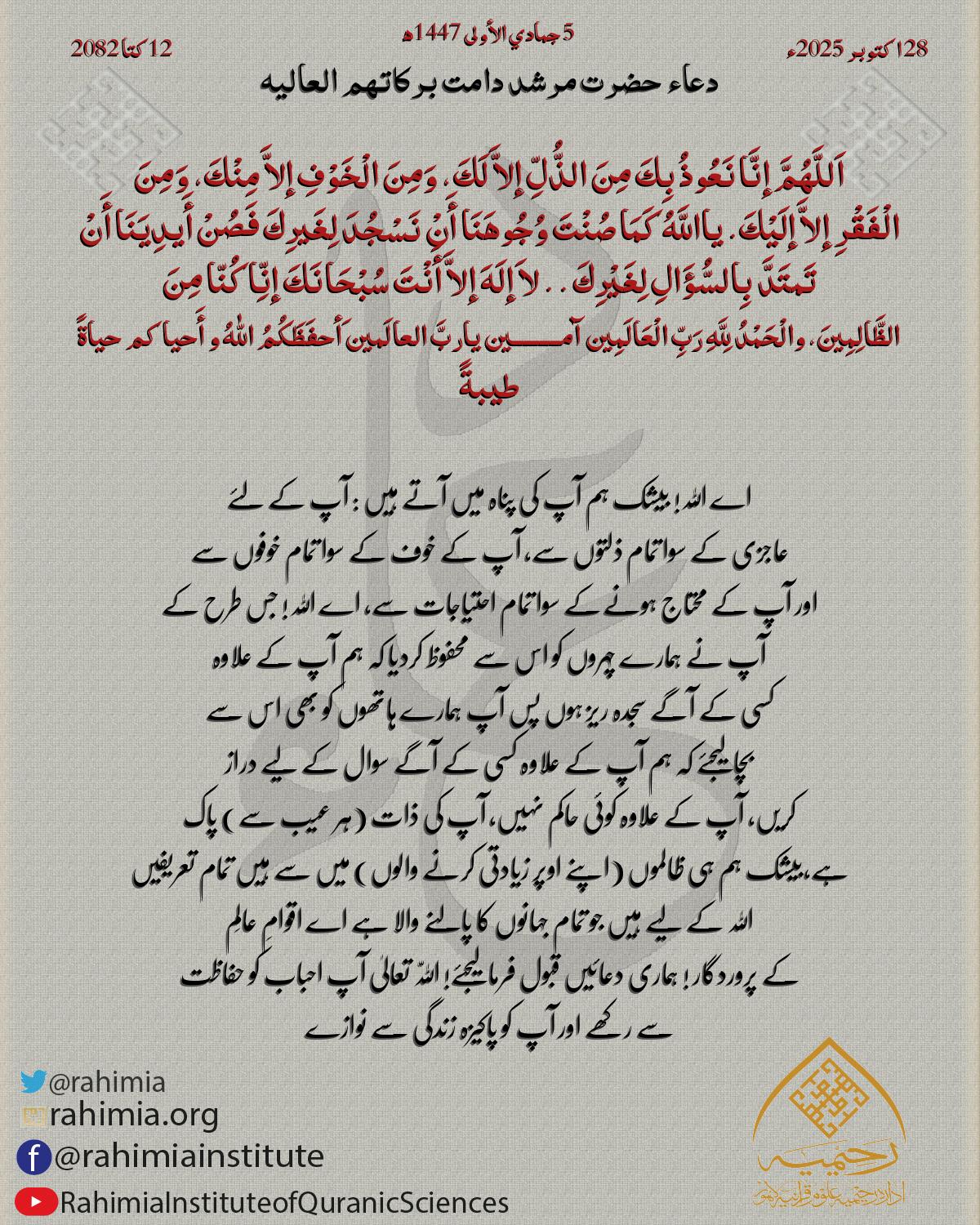 اَلْلّٰهُمَّ إِنَّا نَسْئَلُكَ بِنُوْرِ وَجْھِكَ الَّذِیْ أَشْرَقَتْ لَهُ الْسَّمٰوٰتُ وَ الْأَرْضُ وَ صَلَحَ بِهٖ أَمْرُ الْدُّنْیَا وَ الْآخِرَةِ أَنْ تَجْعَلَنَا وَ أَھْلَنَا وَ أَحِبَّتَنَا فِیْ حِرْزِكَ وَ حِفْظِكَ …