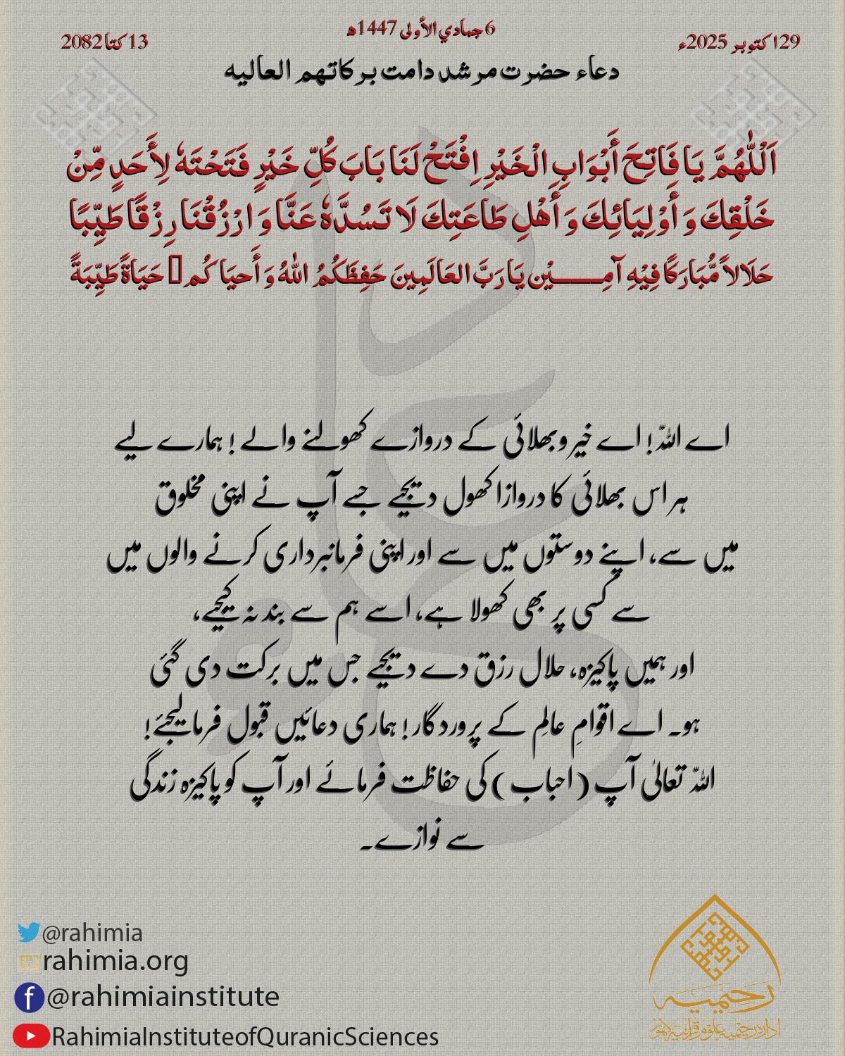 اَلْلّٰهُمَّ یَا فَاتِحَ أَبْوَابِ الْخَیْرِ اِفْتَحْ لَنَا بَابَ کُلِّ خَیْرٍ فَتَحْتَهٗ لِأَحَدٍ مِّنْ خَلْقِكَ وَ أَوْلِیَائِكَ وَ أَھْلِ طَاعَتِكَ لَا تَسُدَّهٗ عَنَّا وَ ارْزُقْنَا رِزْقًا طَیِّبًا حَلَالاً مُّ…
