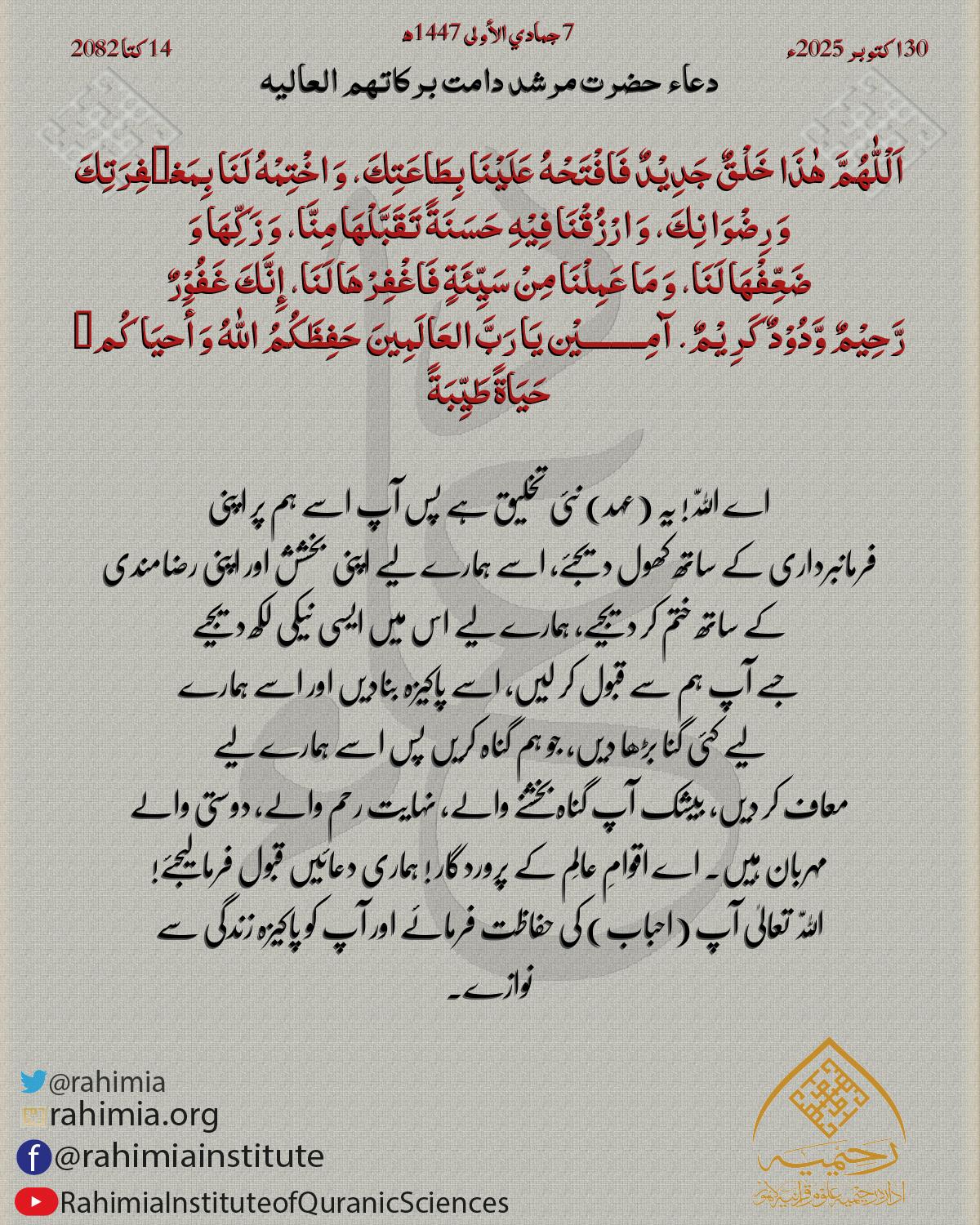 اَلْلّٰهُمَّ ھٰذَا خَلْقٌ جَدِیْدٌ فَافْتَحْهُ عَلَیْنَا بِطَاعَتِكَ، وَ اخْتِمْهُ لَنَا بِمَغ٘فِرَتِكَ وَ رِضْوَانِكَ، وَ ارْزُقْنَا فِیْهِ حَسَنَةً تَقَبَّلْھَا مِنَّا، وَ زَکِّھَا وَ ضَعِّفْھَا لَنَا، وَ مَ…