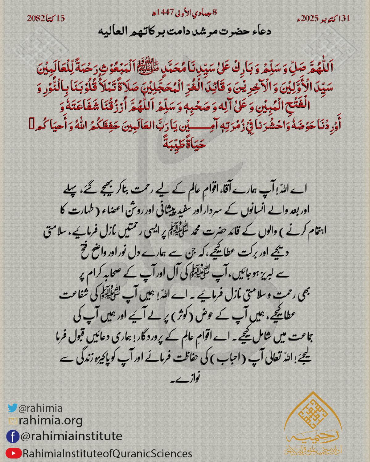 اَللّٰهُمَّ صَلِّ وَ سَلِّمْ وَ بَارِكْ عَلیٰ سَیِّدِنَا مُحَمَّدٍ ﷺ اَلْمَبْعُوْثِ رَحْمَةً لِّلْعَالَمِیْنَ سَیِّدَ الْأَوَّلِیْنَ وَ الْآخِرِیْنَ وَ قَائِدَ الْغُرِّ الْمُحَجَّلِیْنَ صَلَاةً تَمْلَأُ قُلُوْبَنَا بِالْنُّوْرِ…
