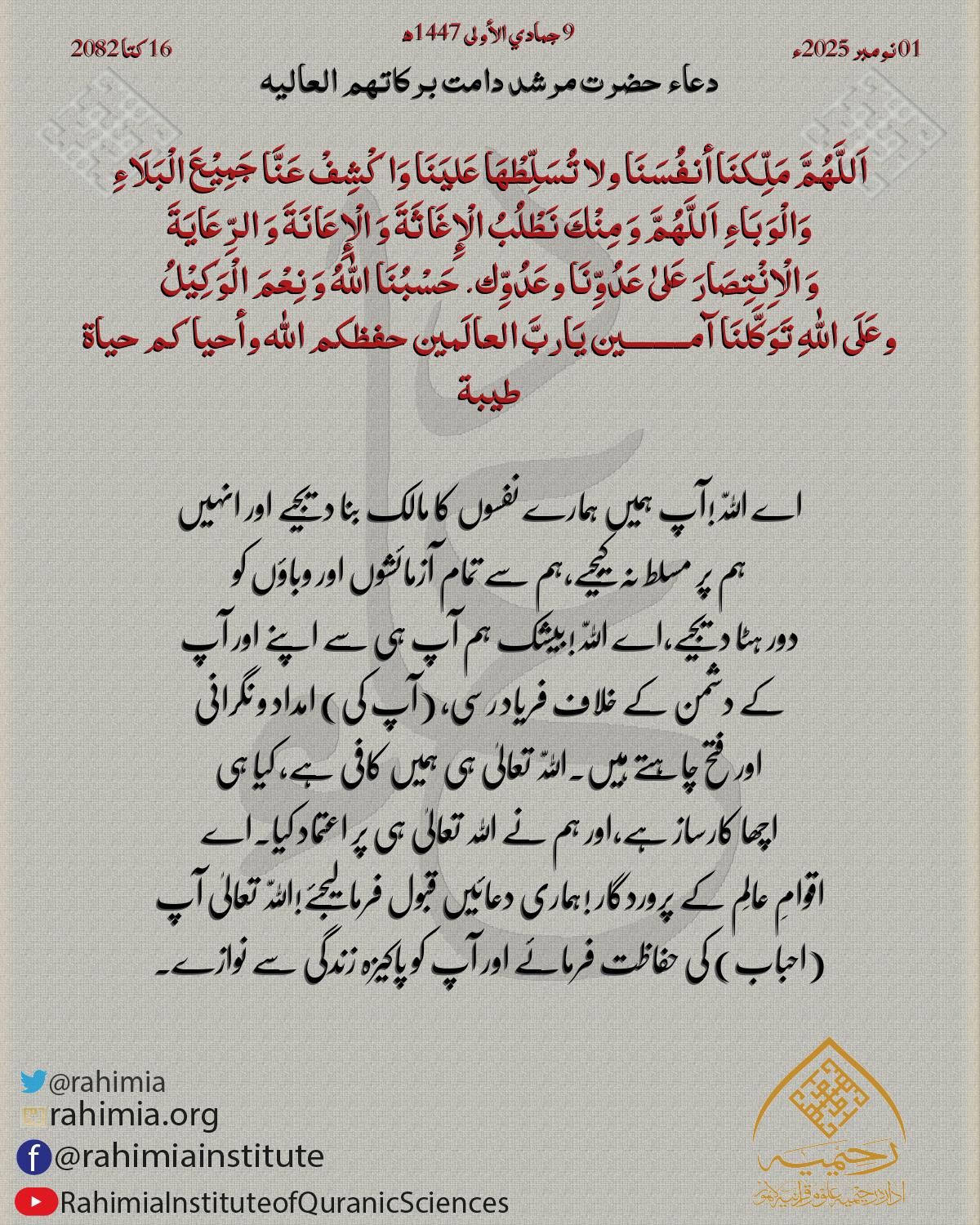 اَللَّهُمَّ مَلِّكنَا أنفُسَنَا ولا تُسَلِّطْهَا عَليَنَا وَاكْشِفْ عَنَّا جَمِيْعَ الْبَلَاءِ وَالْوَبَاءِ اَللَّهُمَّ وَ مِنْكَ نَطْلُبُ الْإِغَاثَةَ وَ الْإِعَانَةَ وَ الرِّعَايَةَ وَ الْاِنْتِصَارَ عَل…