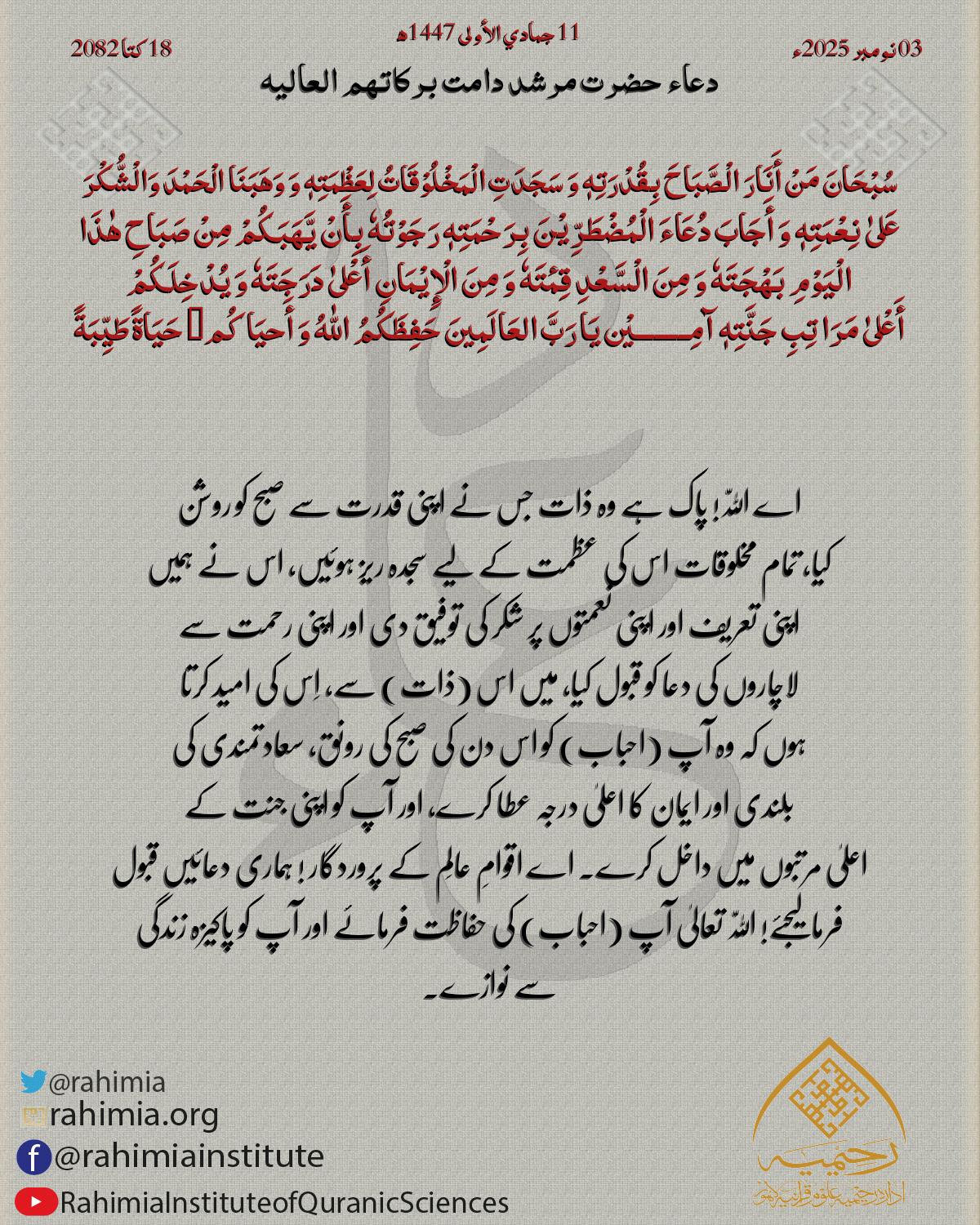 سُبْحَانَ مَنْ أَنَارَ الْصَّبَاحَ بِقُدْرَتِهٖ وَ سَجَدَتِ الْمَخْلُوْقَاتُ لِعَظْمَتِهٖ وَ وَھَبَنَا الْحَمْدَ وَالْشُّکْرَ عَلیٰ نِعْمَتِهٖ وَ أَجَابَ دُعَاءَ الْمُضْطَرِّیْنَ بِرَحْمَتِهٖ رَجَوْتُهٗ بِأَنْ یَّھَبَکُمْ …