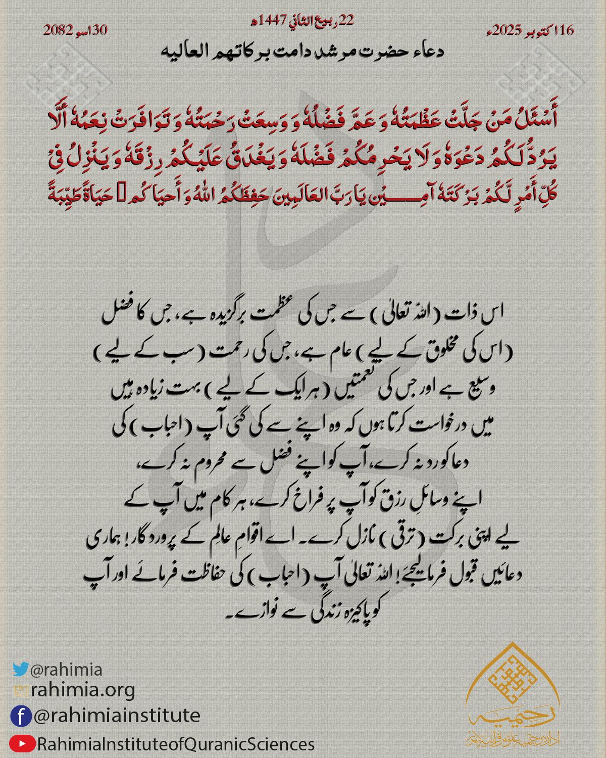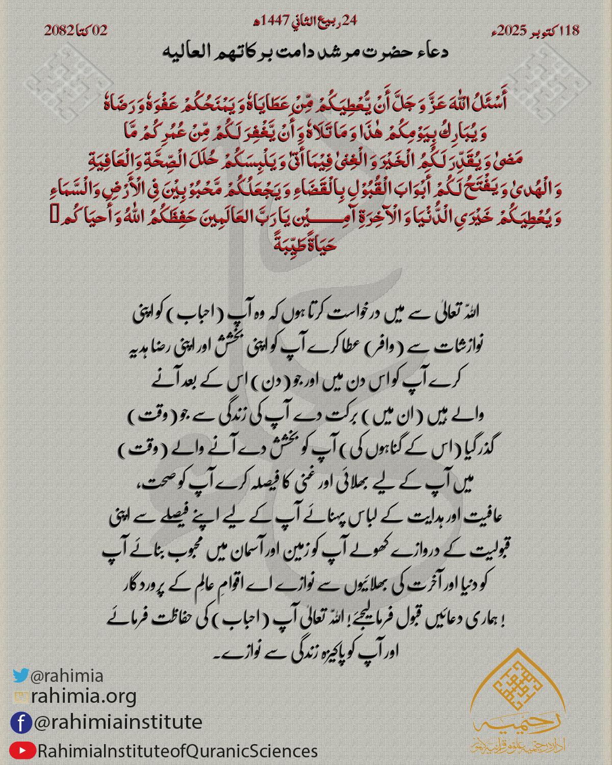 أَسْئَلُ الْلّٰهَ عَزَّ وَ جَلَّ أَنْ یُّعْطِیَکُمْ مِّنْ عَطَایَاهٗ وَ یَمْنَحُکُمْ عَفْوَهٗ وَ رَضَاهٗ وَ یُبَارِكُ بِیَوْمِکُمْ ھٰذَا وَ مَا تَلَاہٗ وَ أَنْ یَّغْفِرَ لَکُمْ مِّنْ عُمُرِکُمْ مَّا مَضیٰ وَ یُقَدِّ…