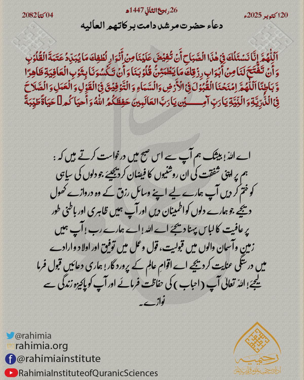اَلْلّٰهُمَّ إِنَّا نَسْئَلُكَ فِیْ ھٰذَا الْصَّبَاحِ أَنْ تُفِیْضَ عَلَیْنَا مِنْ أَنْوَارِ لُطْفِكَ مَا یُبَدِّدُ عَتَمَةَ الْقُلُوْبِ وَ أَنْ تَفْتَحَ لَنَا مِنْ أَبْوَابِ رِزْقِكَ مَا یَطْمَئِنُّ قُلُوْبَنَا وَ …