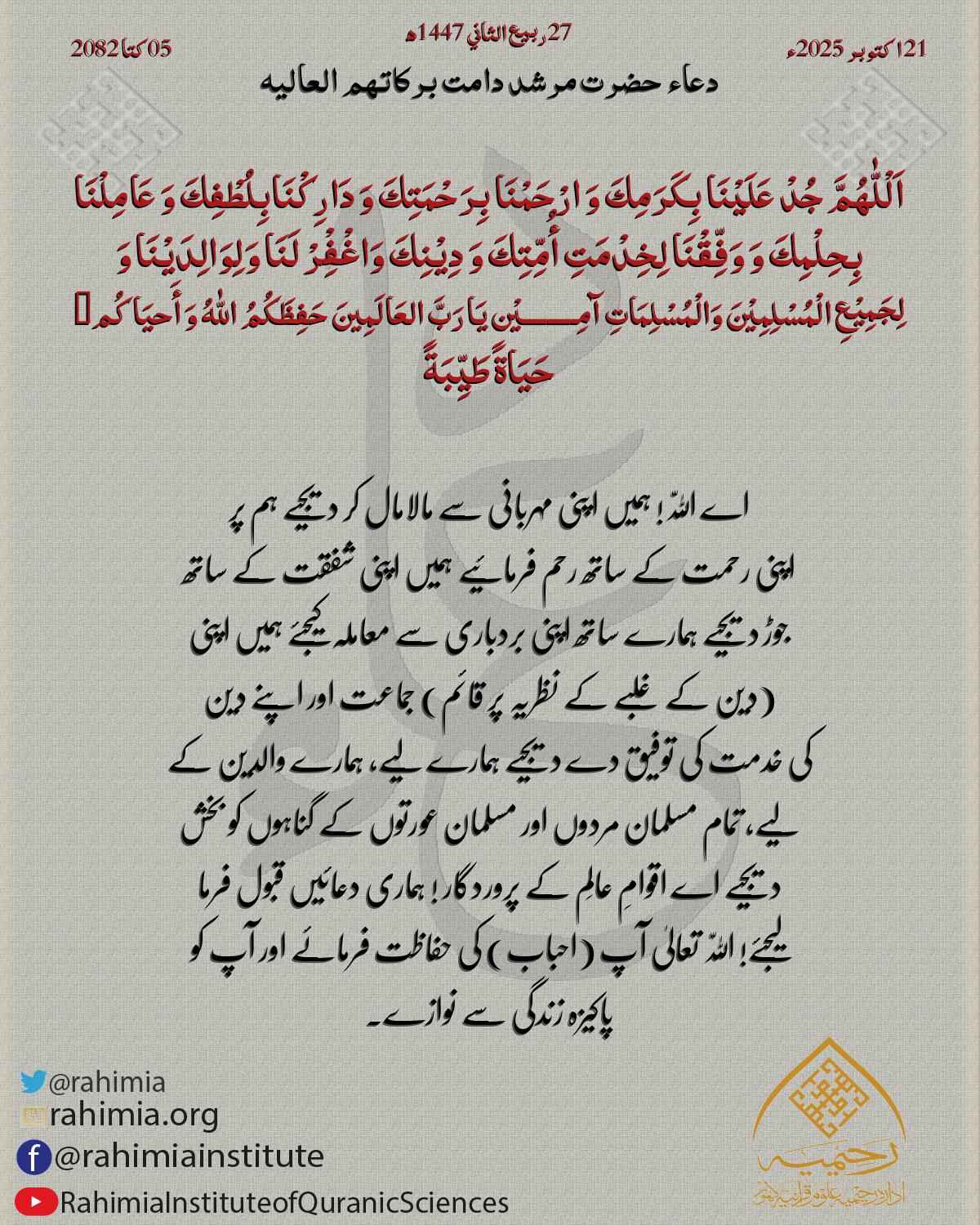 اَلْلّٰهُمَّ لَا تُضِلَّ بِنَا فِیْ حَالٍ مِّنْ أَحْوَالِنَا وَ اسْتَعْمِلْنَا فِیْمَا تَرْضیٰ بِهٖ عَنَّا وَ اجْعَلْ لَّنَا مِنْ لَّدُنْكَ وَلِیَّا وَّ اجْعَلْ لَّنَا مِنْ لَّدُنْكَ نَصِیْرًا. اَلْلّٰهُمَّ اِحْفَظْ …