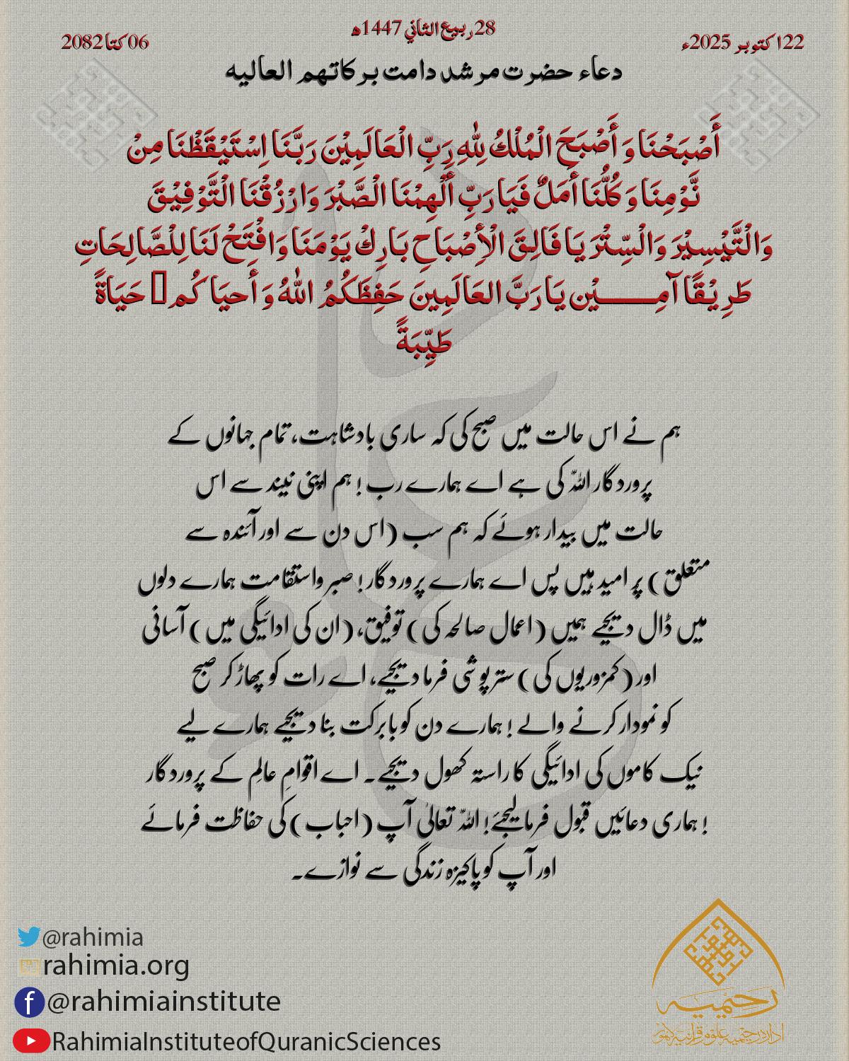 أَصْبَحْنَا وَ أَصْبَحَ الْمُلْكُ لِلّٰهِ رَبِّ الْعَالَمِیْنَ رَبَّنَا اِسْتَیْقَظْنَا مِنْ نَّوْمِنَا وَ کُلُّنَا أَمَلٌ فَیَا رَبِّ أَلْھِمْنَا الْصَّبْرَ وَارْزُقْنَا الْتَّوْفِیْقَ وَالْتَّیْسِیْرَ وَالْسِّتْرَ یَ…