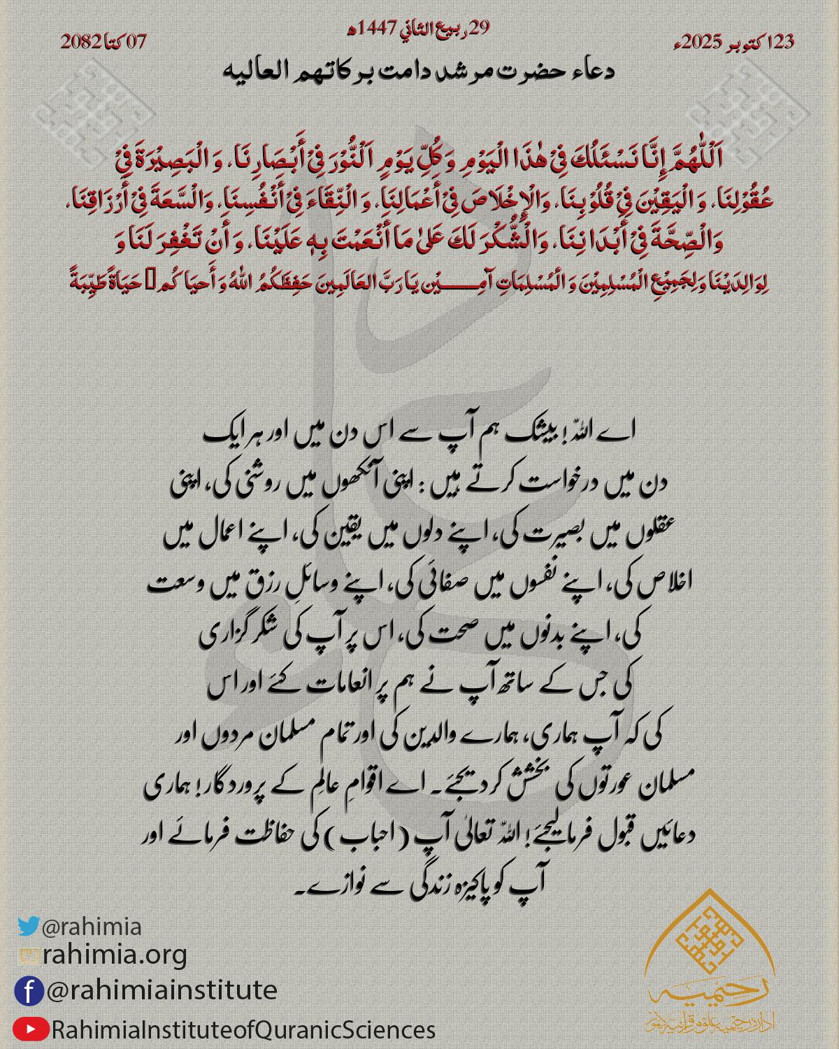 اَلْلّٰهُمَّ إِنَّا نَسْئَلُكَ فِیْ ھٰذَا الْیَوْمِ وَ کُلِّ یَوْمٍ اَلْنُّوْرَ فِیْ أَبْصَارِنَا، وَ الْبَصِیْرَةَ فِیْ عُقُوْلِنَا، وَ الْیَقِیْنَ فِیْ قُلُوْبِنَا، وَالْإِخْلَاصَ فِیْ أَعْمَالِنَا، وَ الْنِّقَاءَ…