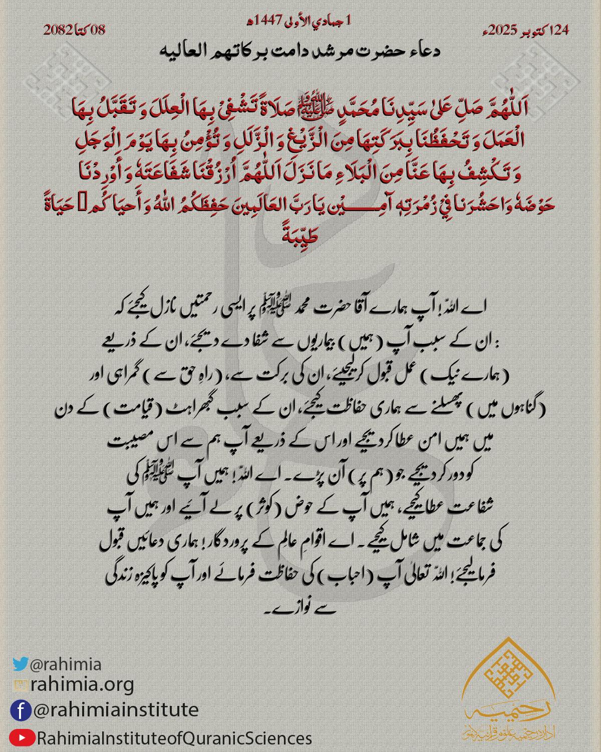 اَللّٰهُمَّ صَلِّ عَلیٰ سَیِّدِنَا مُحَمَّدٍ ﷺ صَلَاةً تَشْفِیْ بِھَا الْعِلَلَ وَ تَقَبَّلُ بِھَا الْعَمَلَ وَ تَحْفَظُنَا بِبَرَکَتِھَا مِنَ الْزَّیْغِ وَ الْزَّلَلِ وَ تُؤْمِنُ بِھَا یَوْمَ الْوَجَلِ وَ تَکْشِفُ بِھَ…