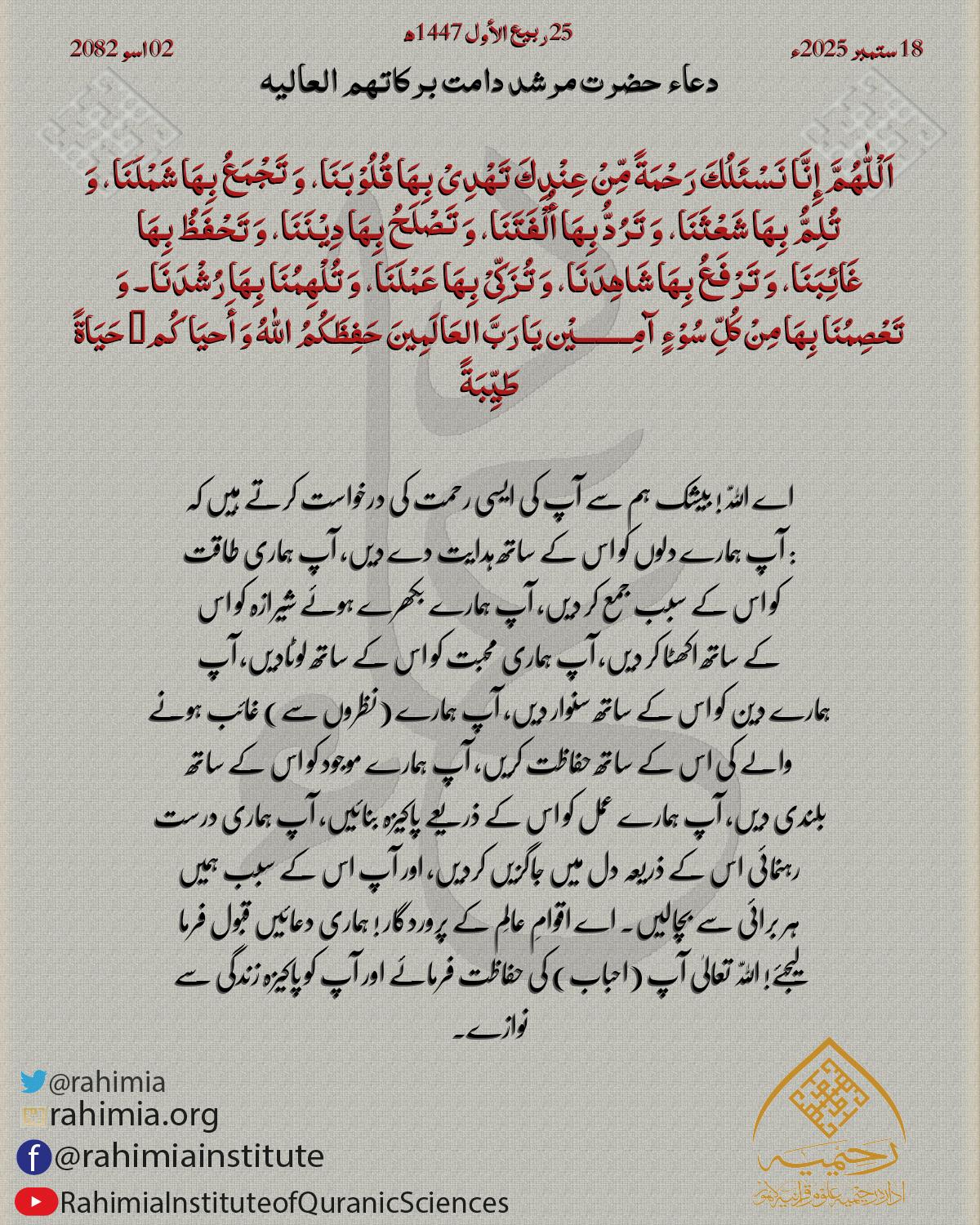 اَلْلّٰهُمَّ إِنَّا نَسْئَلُكَ رَحْمَةً مِّنْ عِنْدِكَ تَھْدِیْ بِھَا قُلُوْبَنَا، وَ تَجْمَعُ بِھَا شَمْلَنَا، وَ تُلِمُّ بِھَا شَعْثَنَا، وَ تَرُدُّ بِھَا أُلْفَتَنَا، وَ تَصْلَحُ بِھَا دِیْنَنَا، وَ تَحْ…
