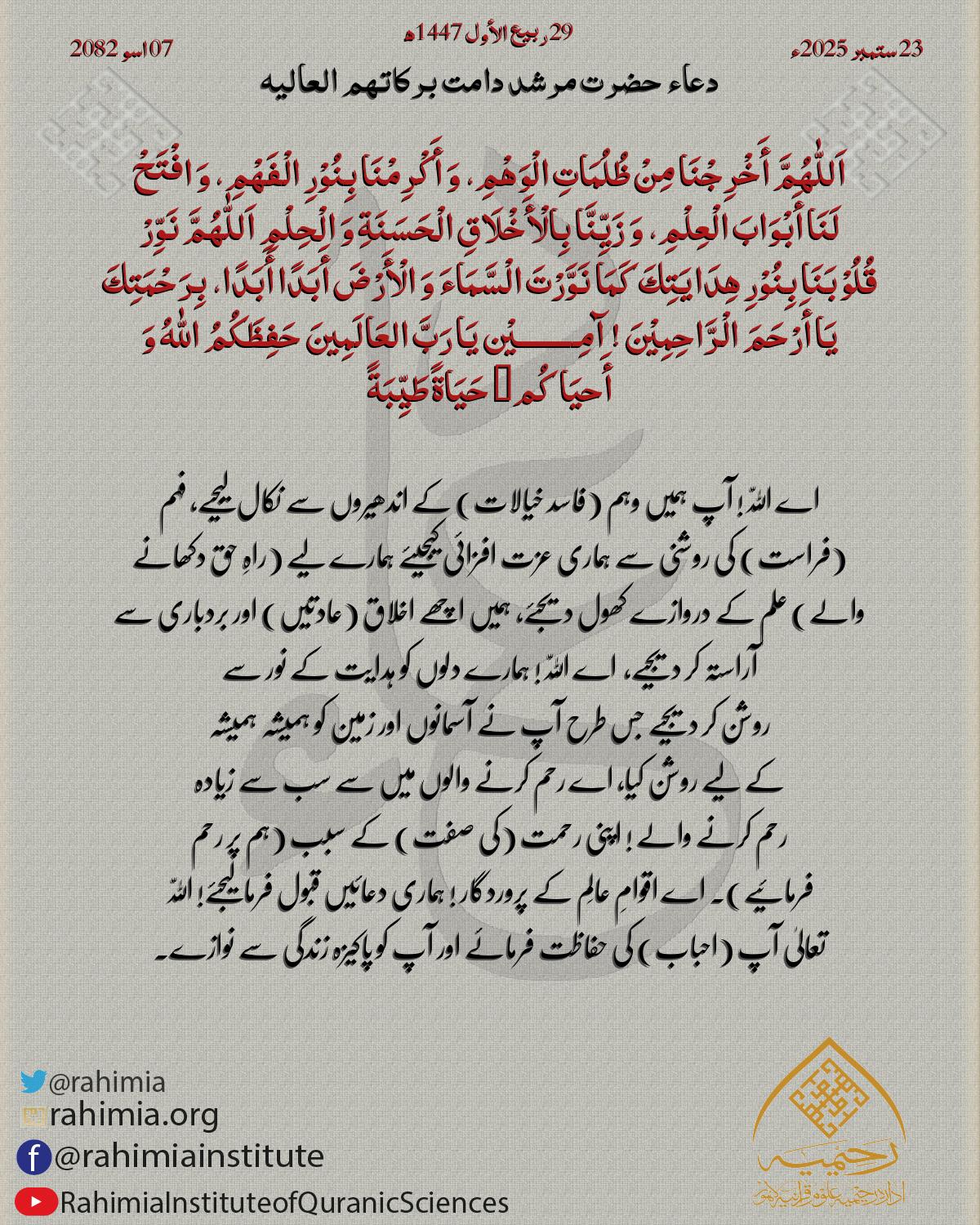 اَللّٰهُمَّ أَخْرِجْنَا مِنْ ظُلُمَاتِ الْوَھْمِ، وَ أَکْرِمْنَا بِنُوْرِ الْفَھْمِ، وَ افْتَحْ لَنَا أَبْوَابَ الْعِلْمِ، وَ زَیِّنَّا بِالْأَخْلَاقِ الْحَسَنَةِ وَ الْحِلْمِ اَللّٰهُمَّ نَوِّرْ قُلُوْبَنَا…