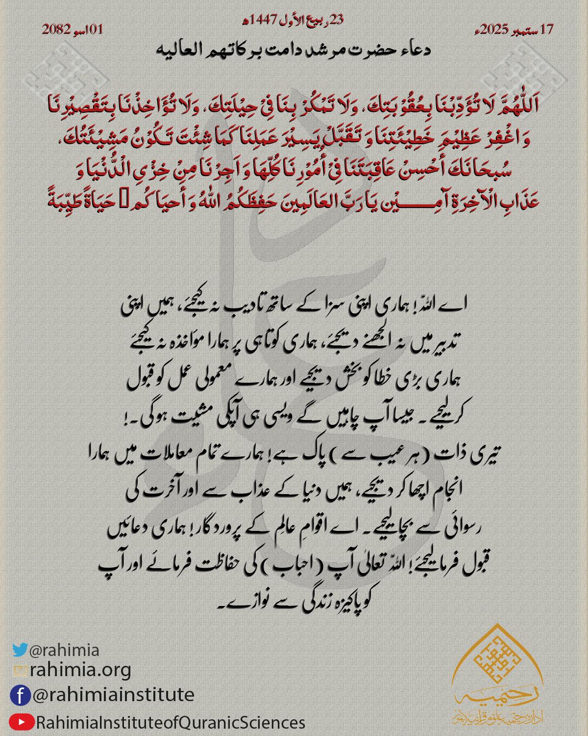 اَلْلّٰهُمَّ إِنَّا نَسْئَلُكَ رَحْمَةً مِّنْ عِنْدِكَ تَھْدِیْ بِھَا قُلُوْبَنَا، وَ تَجْمَعُ بِھَا شَمْلَنَا، وَ تُلِمُّ بِھَا شَعْثَنَا، وَ تَرُدُّ بِھَا أُلْفَتَنَا، وَ تَصْلَحُ بِھَا دِیْنَنَا، وَ تَحْ…