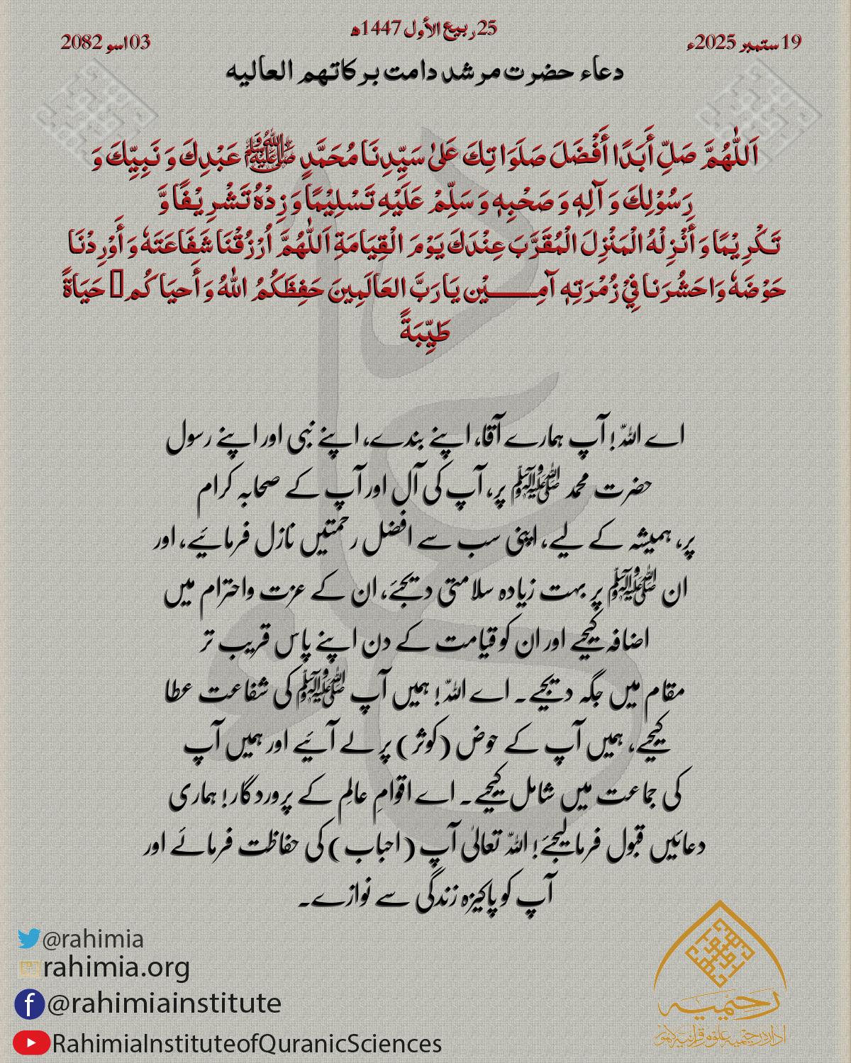 اَللّٰهُمَّ صَلِّ أَبَدًا أَفْضَلَ صَلَوَاتِكَ عَلیٰ سَیِّدِنَا مُحَمَّدٍ ﷺ عَبْدِكَ وَ نَبِیِّكَ وَ رَسُوْلِكَ وَ آلِهٖ وَ صَحْبِهٖ وَ سَلِّمْ عَلَیْهِ تَسْلِیْمًا وَ زِدْهُ تَشْرِیْفًا وَّ تَکْرِیْمًا وَ أَنْزِلْهُ …