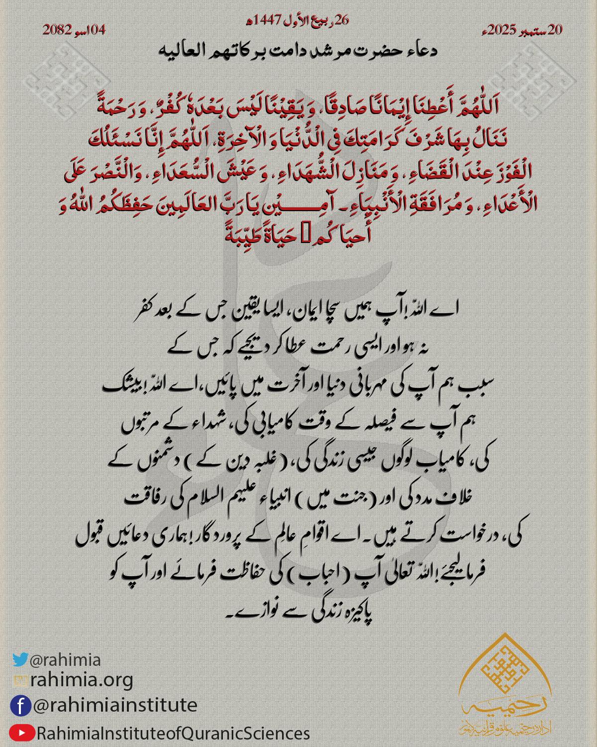 اَللّٰهُمَّ أَعْطِنَا إِیْمَانًا صَادِقًا، وَ یَقِیْنًا لَیْسَ بَعْدَهٗ کُفْرٌ، وَ رَحْمَةً نَنَالُ بِھَا شَرْفَ کَرَامَتِكَ فِی الْدُّنْیَا وَ الْآخِرَةِ، اَللّٰهُمَّ إِنَّا نَسْئَلُكَ الْفَوْزَ عِنْدَ الْقَضَ…