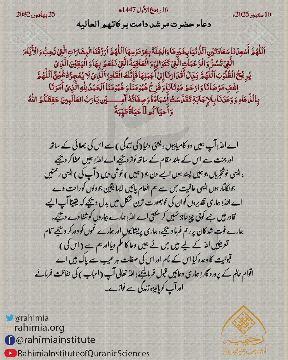 اَلْلّٰهُمَّ أَسْعِدْنَا سَعَادَتَیْنِ اَلْدُّنْیَا بِخَیْرِھَا وَالْجَنَّةَ بِفِرْدَوْسِھَا اَلْلّٰهُمَّ اُرْزُقْنَا الْبِشَارَاتِ الَّتِیْ نُحِبُّ وَ الْأَیَّامَ الَّتِیْ تَسُرُّ وَ الْرَّحْمَاتِ الَّتِیْ تَتَوَالِیْ وَ…