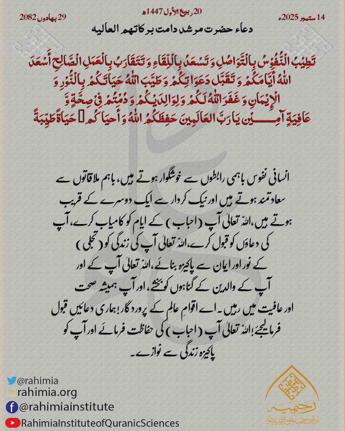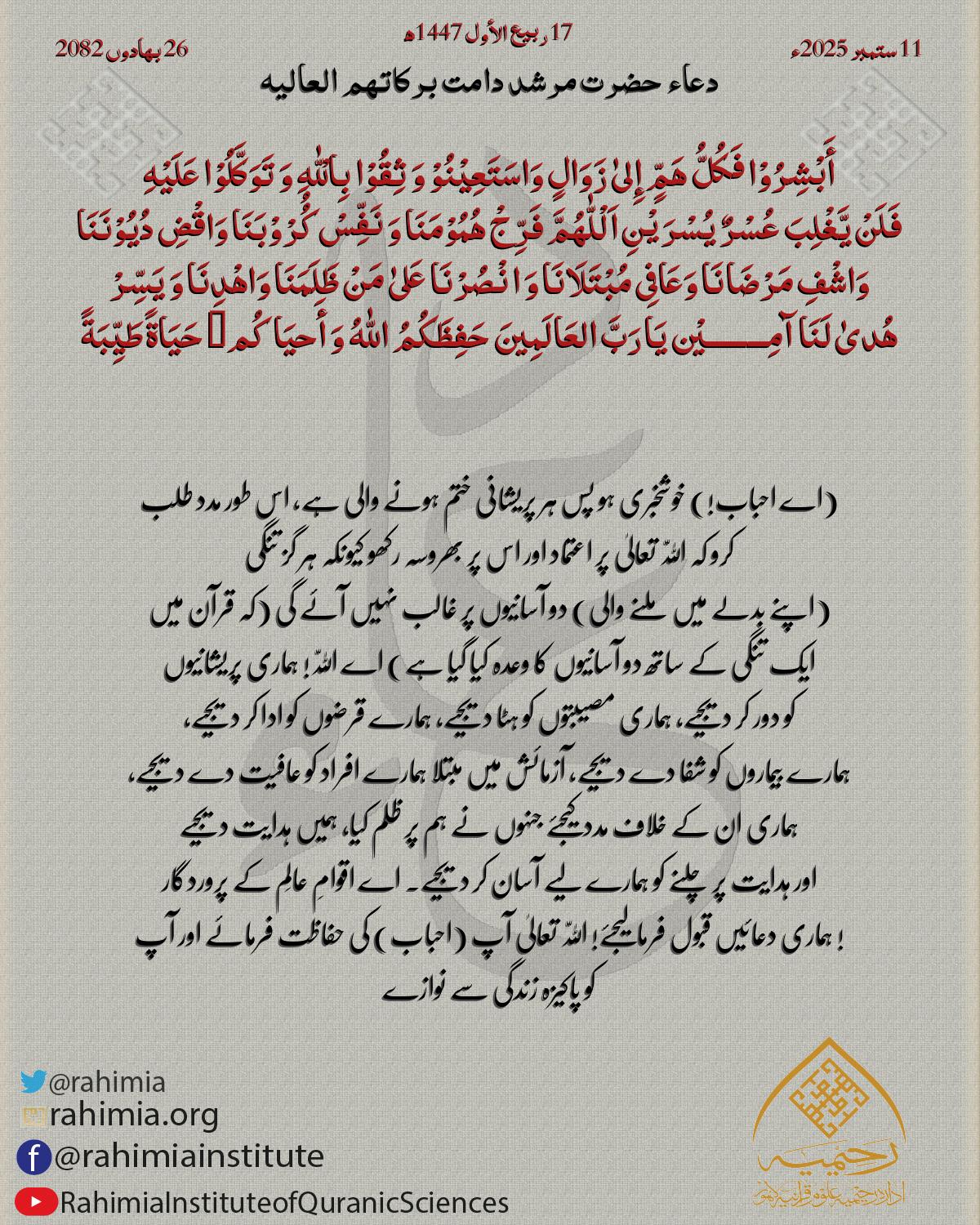 أَبْشِرُوْا فَکُلُّ ھَمٍّ إِلیٰ زَوَالٍ وَاسَتَعِیْنُوْ وَ ثِقُوْا بِالْلّٰهِ وَ تَوَکَّلُوْا عَلَیْهِ فَلَنْ یَّغْلِبَ عُسْرٌ یُسْرَیْنِ اَلْلّٰهُمَّ فَرِّجْ ھُمُوْمَنَا وَ نَفِّسْ کُُرْوْبَنَا وَاقْضِ دُیُوْنَنَا وَاشْفِ مَ…