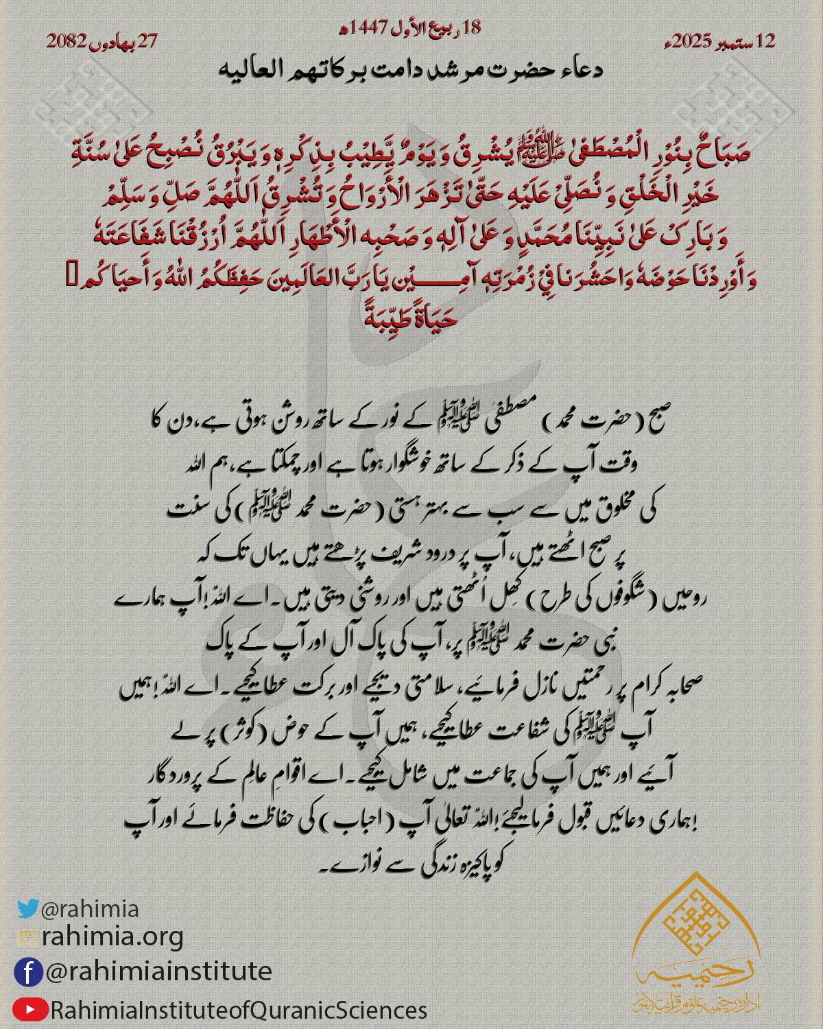 صَبَاحٌ بِنُوْرِ الْمُصْطَفیٰ ﷺ یُشْرِقُ وَ یَوْمٌ یَّطِیْبُ بِذِکْرِهٖ وَ یَبْرُقُ نُصْبِحُ عَلیٰ سُنَّةِ خَیْرِ الْخَلْقِ وَ نُصَلِّیْ عَلَیْهِ حَتّیٰ تَزْھَرَ الْأَرْوَاحُ وَ تُشْرِقُ اَللّٰهُمَّ صَلِّ وَ سَلِّمْ وَ…