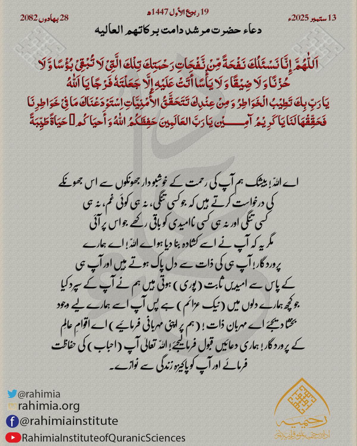 اَللّٰهُمَّ إِنَّا نَسْئَلُكَ نَفْحَةً مِّنْ نَّفْحَاتِ رَحْمَتِكَ تِلْكَ الَّتِیْ لَا تُبْقِیْ بُؤْسًا وَّ لَا حُزْنًا وَ لَا ضِیْقًا وَ لَا یَأْسًا أَتَتْ عَلَیْهِ إِلَّا جَعَلْتَهٗ فَرْجًا یَا اَللّٰهُ یَا رَبِّ …